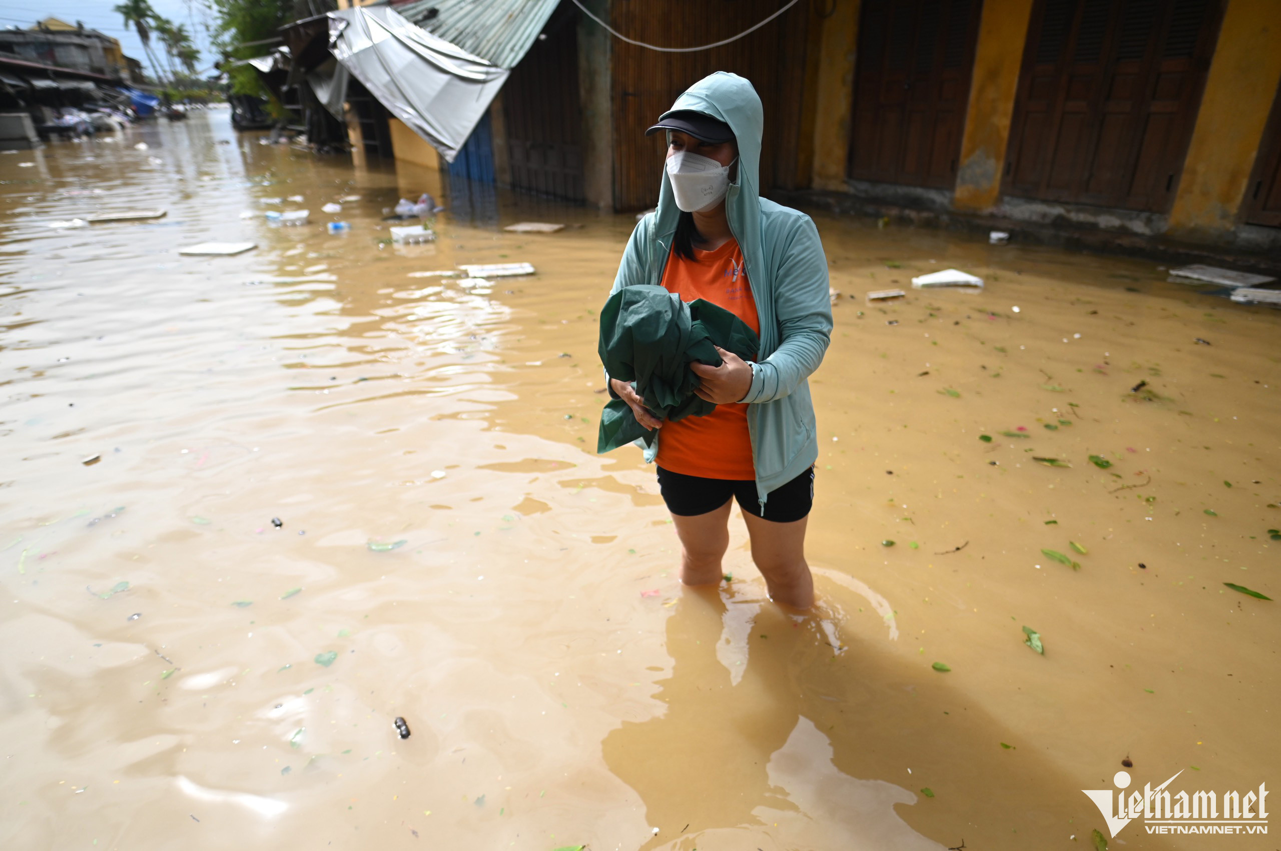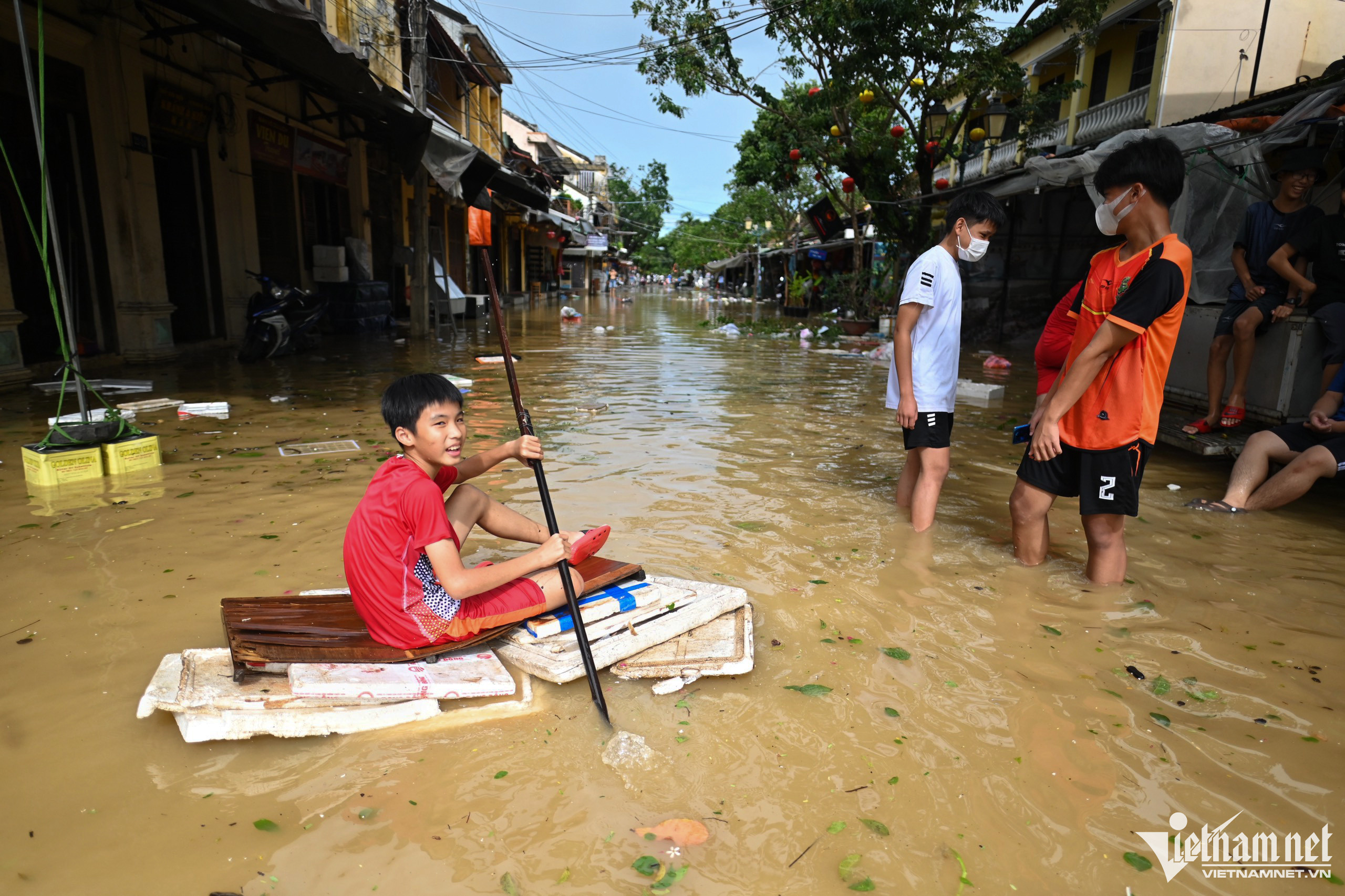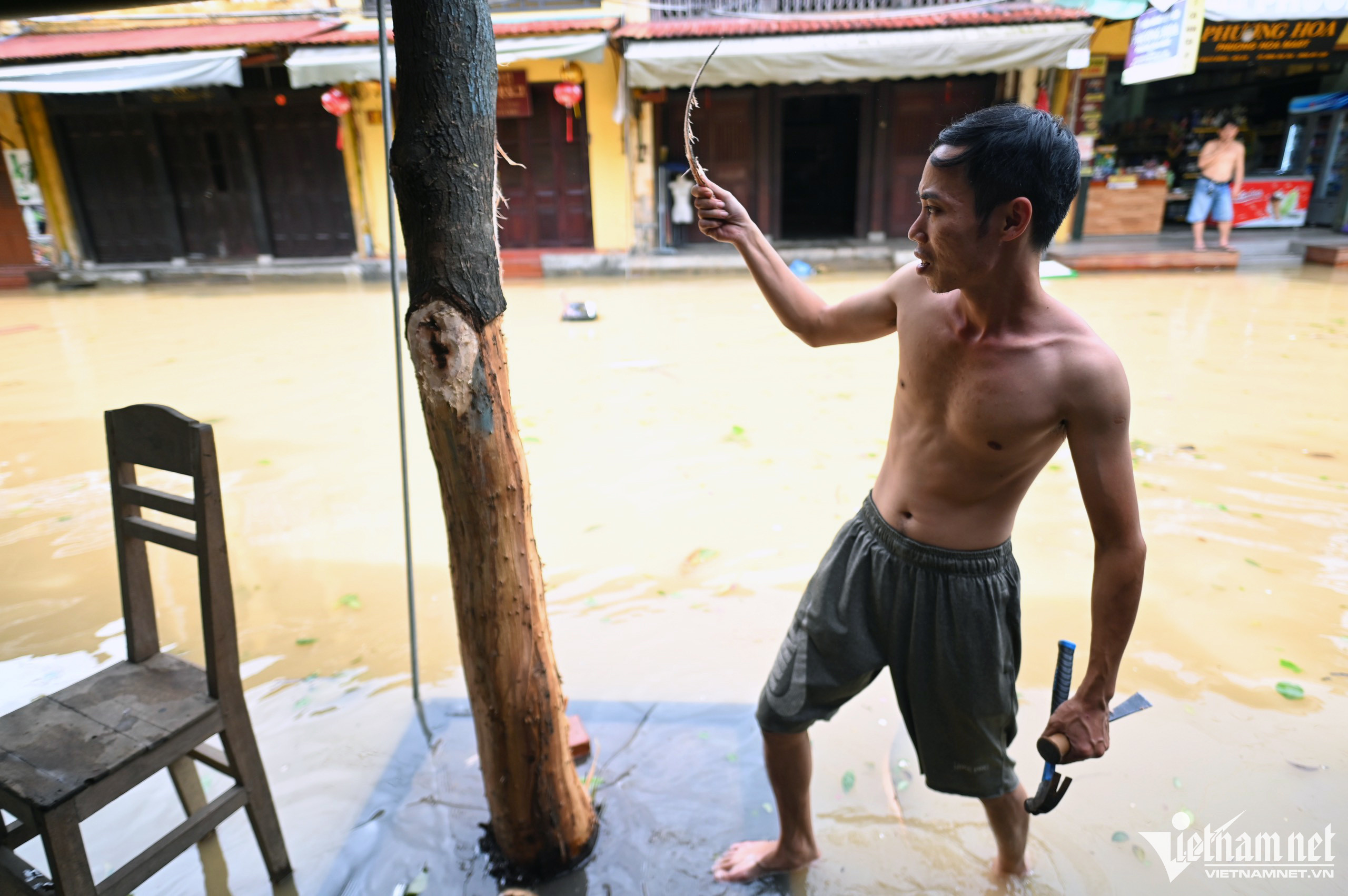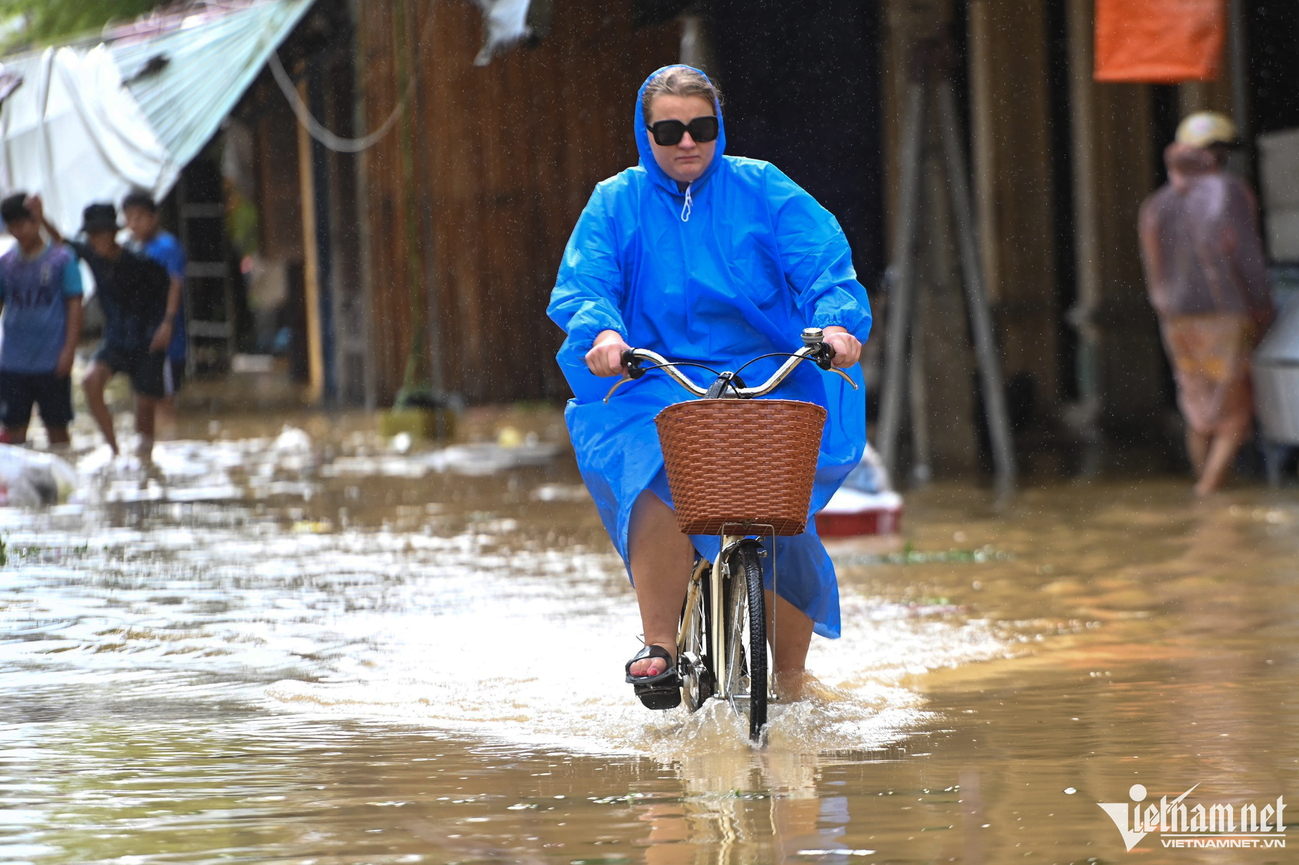 14h chiều 28/9, cây cối vẫn ngổn ngang trên các tuyến đường trung tâm. 14h30, đường Bạch Đằng (phường Minh An) vẫn trong cảnh mênh mông nước ngập. Chị Thu Cúc đi thu dọn đồ đạc của gia đình tại chợ Hội An phải lội bì bõm. “Mùa lũ nào cũng ngập nhưng năm nay vừa bão xong giờ lại lo nước lớn đổ về, người dân nơi đây vất vả lắm”, chị Cúc nói.Nhiều người dân vội vã dọn dẹp nhà cửa, sửa lại những vật dụng bị hỏng trong cảnh nước rút rất chậm.Anh Đoàn Lợi (thứ 2 từ phải sang) cùng bạn bè ngồi uống cà phê trước cửa nhà. “Tôi sinh sống và làm việc ở Hội An đã nhiều năm và không ít lần chứng kiến cảnh thành phố này ngập lụt, đúng là vừa khóc vừa cười”, anh Lợi nói.Dịp này, nhiều người nước ngoài bất đắc dĩ được chứng kiến cảnh mưa bão tại Hội An. Chị Emma tới Việt Nam du lịch được 4 tuần. Nữ du khách phấn khích lội nước chụp ảnh, lưu lại làm kỷ niệm. “Tôi đã chứng kiến cơn bão rất lớn đêm qua và giờ là cảnh ngập nước. Chuyến đi này của tôi thực sự rất kỳ lạ”, Emma nói.Giống như Emma, nhiều du khách khác lại thích thú đạp xe dạo quanh những con phố ngập nước.Biết các tuyến đường gần sông bị ngập, Khoa rủ bạn bè gần nhà đi chơi, nghịch nước. Em cùng mọi người ghép những miếng xốp, ván gỗ thành thuyền rồi chèo giữa phố.Thú cưng được chủ cho ngồi xe máy đi qua đoạn đường ngập nước.Nguyễn Thị Kim Lan có cửa tiệm kinh doanh trên phố Bạch Đằng, 15h, chị vẫn ở lại trông coi. “Tôi phải chờ xem nước dâng đến đâu rồi mới về nhà. Nếu nước dồn về nhiều quá thì phải chạy hàng hoá”, nữ tiểu thương nói. Hậu bão, nước sông Thu Bồn không những không rút mà còn tiếp tục dâng lên, chiều 28/9.