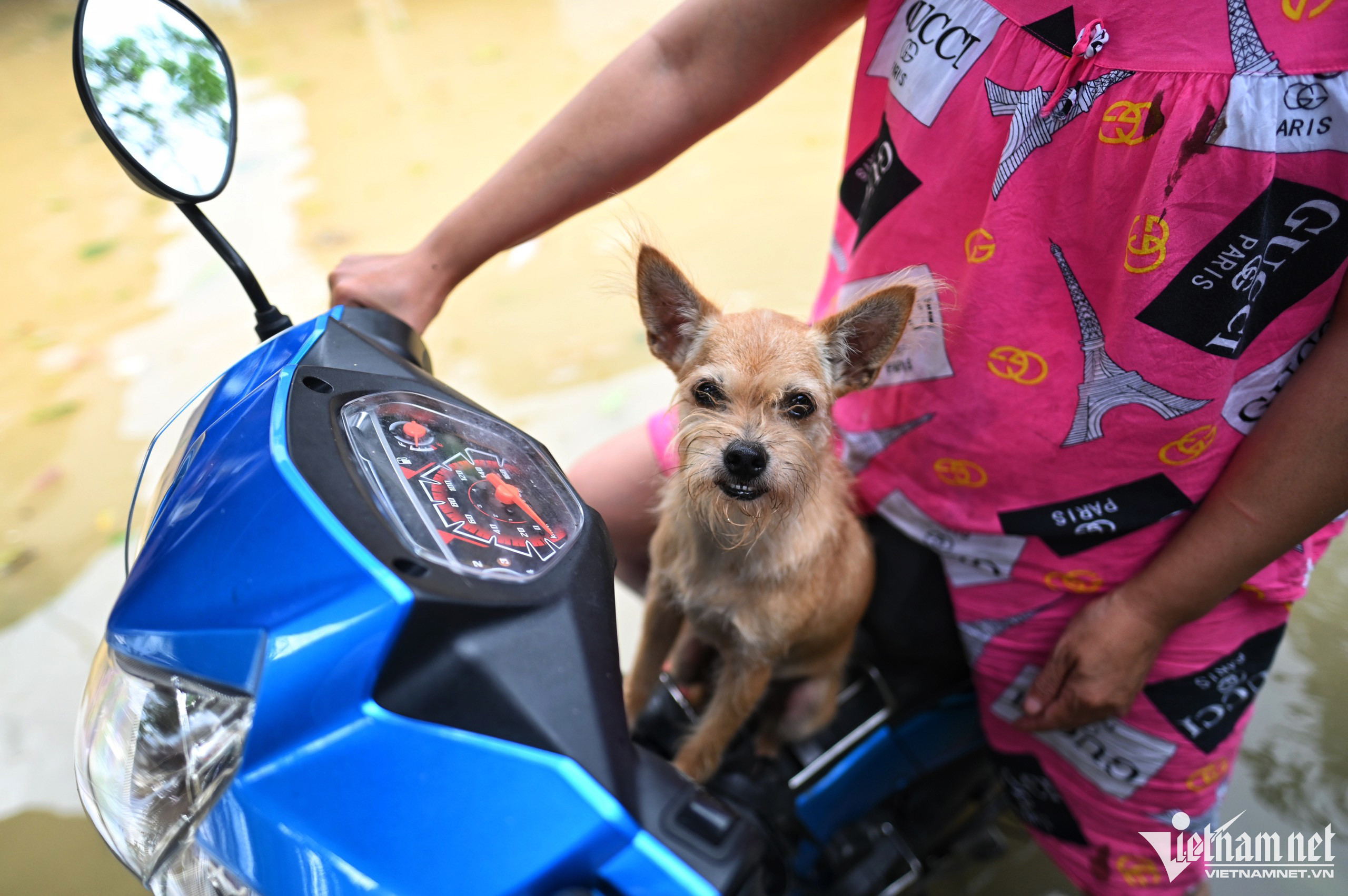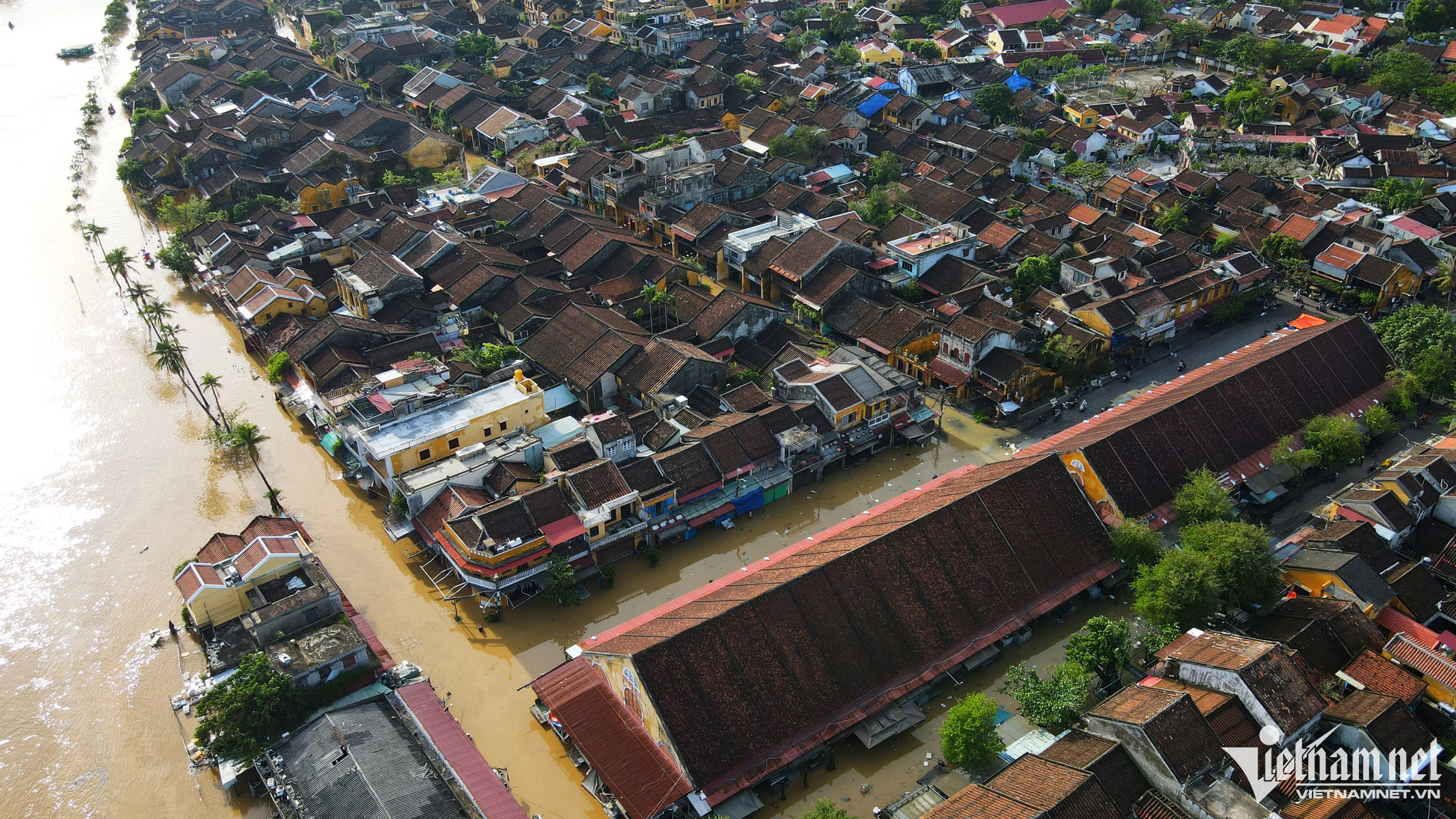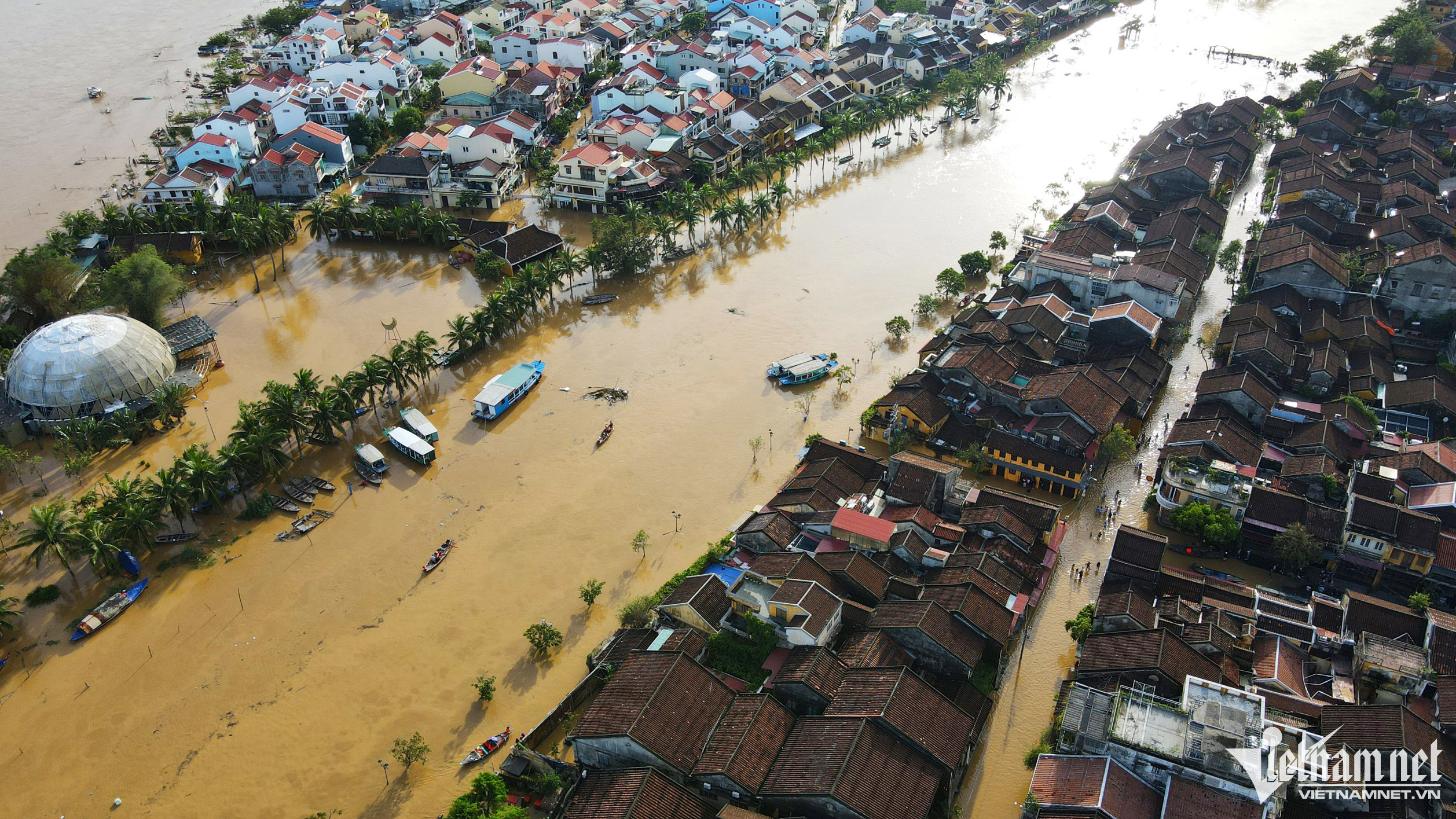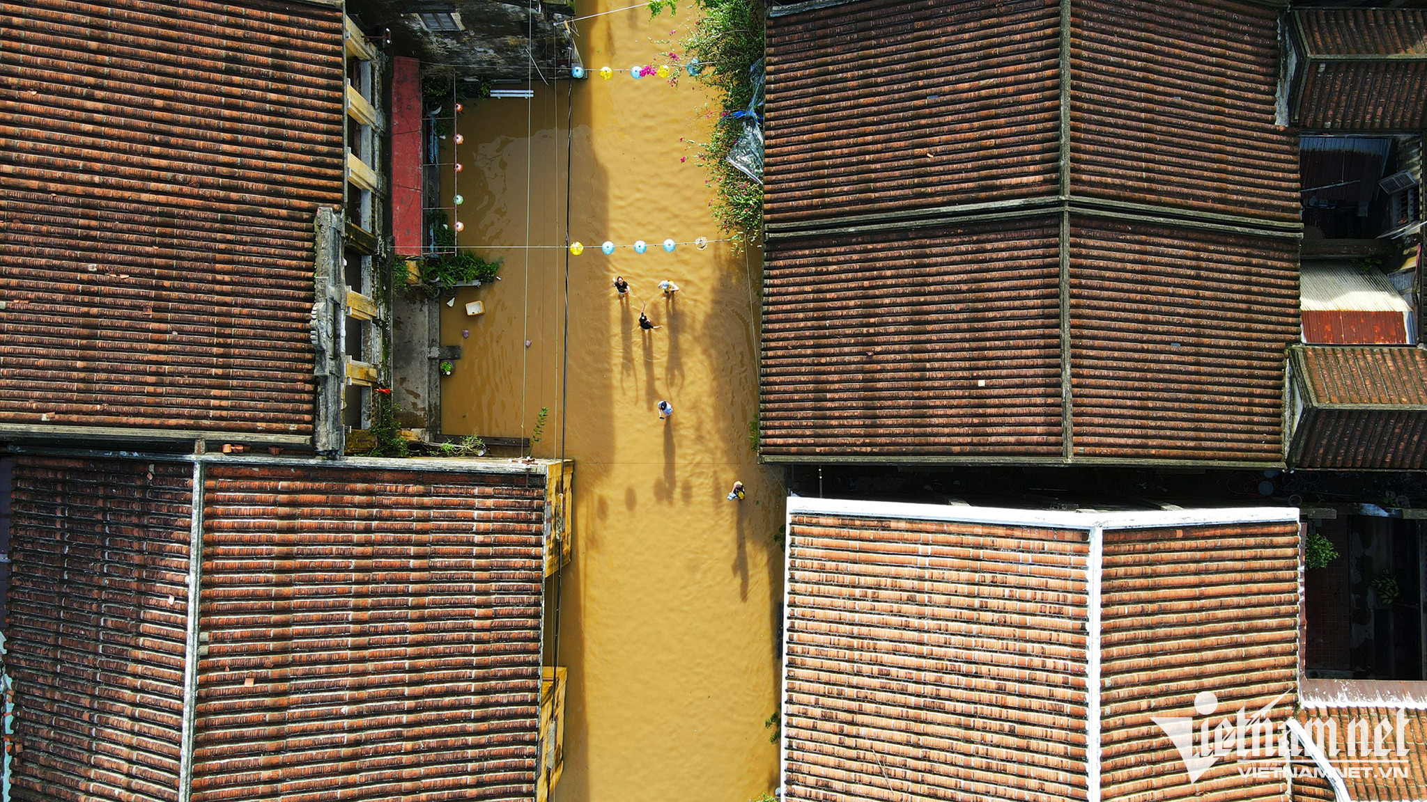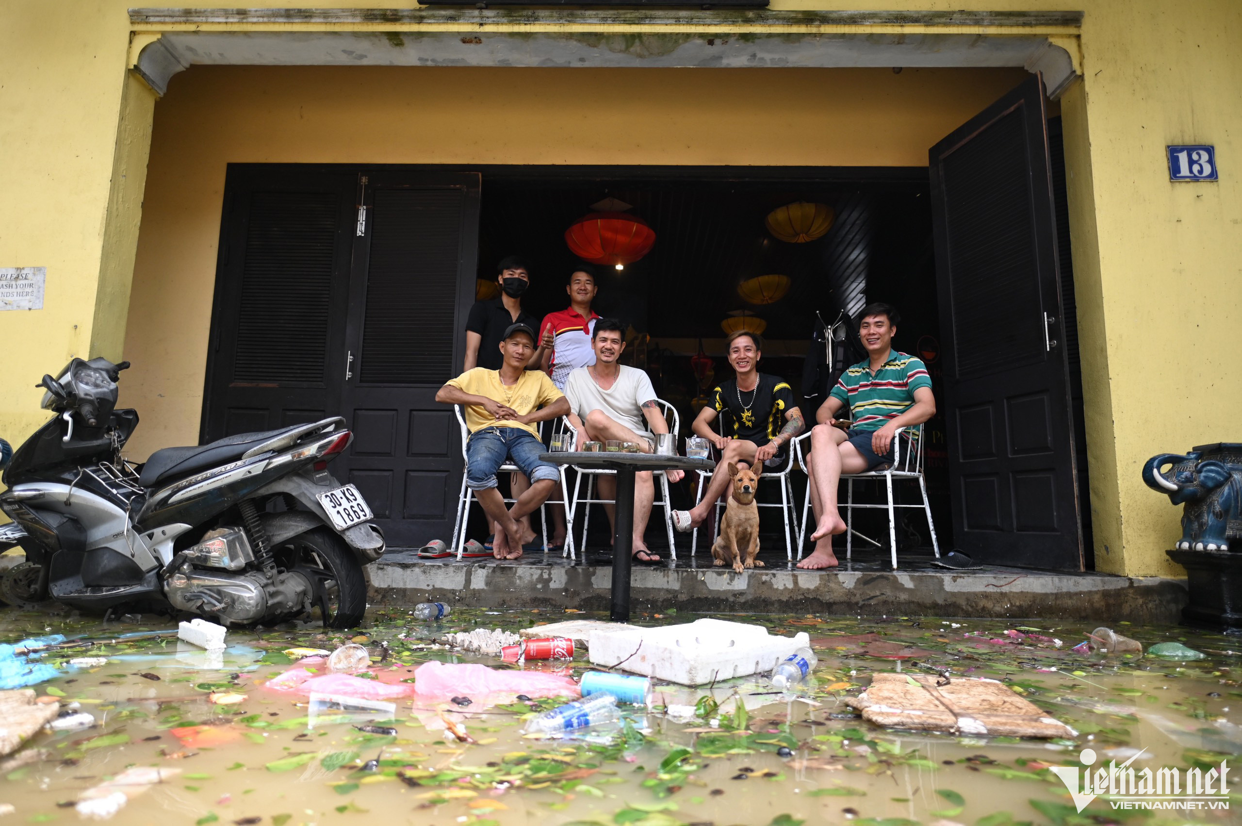 14h chiều 28/9, cây cối vẫn ngổn ngang trên các tuyến đường trung tâm. 14h30, đường Bạch Đằng (phường Minh An) vẫn trong cảnh mênh mông nước ngập. Chị Thu Cúc đi thu dọn đồ đạc của gia đình tại chợ Hội An phải lội bì bõm. “Mùa lũ nào cũng ngập nhưng năm nay vừa bão xong giờ lại lo nước lớn đổ về, người dân nơi đây vất vả lắm”, chị Cúc nói.Nhiều người dân vội vã dọn dẹp nhà cửa, sửa lại những vật dụng bị hỏng trong cảnh nước rút rất chậm.Anh Đoàn Lợi (thứ 2 từ phải sang) cùng bạn bè ngồi uống cà phê trước cửa nhà. “Tôi sinh sống và làm việc ở Hội An đã nhiều năm và không ít lần chứng kiến cảnh thành phố này ngập lụt, đúng là vừa khóc vừa cười”, anh Lợi nói.Dịp này, nhiều người nước ngoài bất đắc dĩ được chứng kiến cảnh mưa bão tại Hội An. Chị Emma tới Việt Nam du lịch được 4 tuần. Nữ du khách phấn khích lội nước chụp ảnh, lưu lại làm kỷ niệm. “Tôi đã chứng kiến cơn bão rất lớn đêm qua và giờ là cảnh ngập nước. Chuyến đi này của tôi thực sự rất kỳ lạ”, Emma nói.Giống như Emma, nhiều du khách khác lại thích thú đạp xe dạo quanh những con phố ngập nước.Biết các tuyến đường gần sông bị ngập, Khoa rủ bạn bè gần nhà đi chơi, nghịch nước. Em cùng mọi người ghép những miếng xốp, ván gỗ thành thuyền rồi chèo giữa phố.Thú cưng được chủ cho ngồi xe máy đi qua đoạn đường ngập nước.Nguyễn Thị Kim Lan có cửa tiệm kinh doanh trên phố Bạch Đằng, 15h, chị vẫn ở lại trông coi. “Tôi phải chờ xem nước dâng đến đâu rồi mới về nhà. Nếu nước dồn về nhiều quá thì phải chạy hàng hoá”, nữ tiểu thương nói. Hậu bão, nước sông Thu Bồn không những không rút mà còn tiếp tục dâng lên, chiều 28/9.