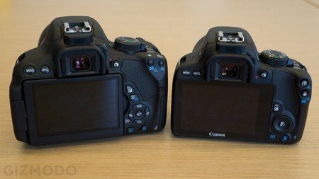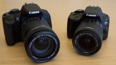 | EOS Rebel SL1 (phải) nhỏ hơn đáng kể so với EOS Rebel T4i (trái). |