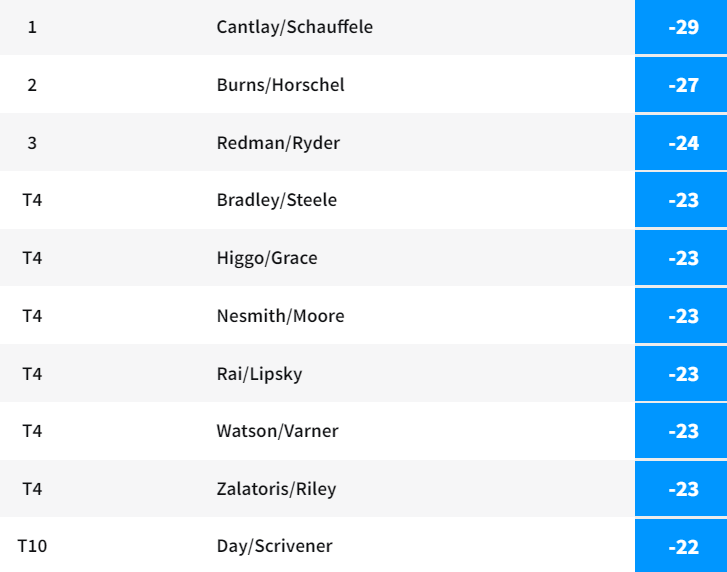 Mặc dù vậy, với việc giữ tổng điểm gậy -29, Cantlay và Schauffele giành chiến thắng trước cặp Sam Burns và Billy Horschel - những người đạt điểm gậy -27.