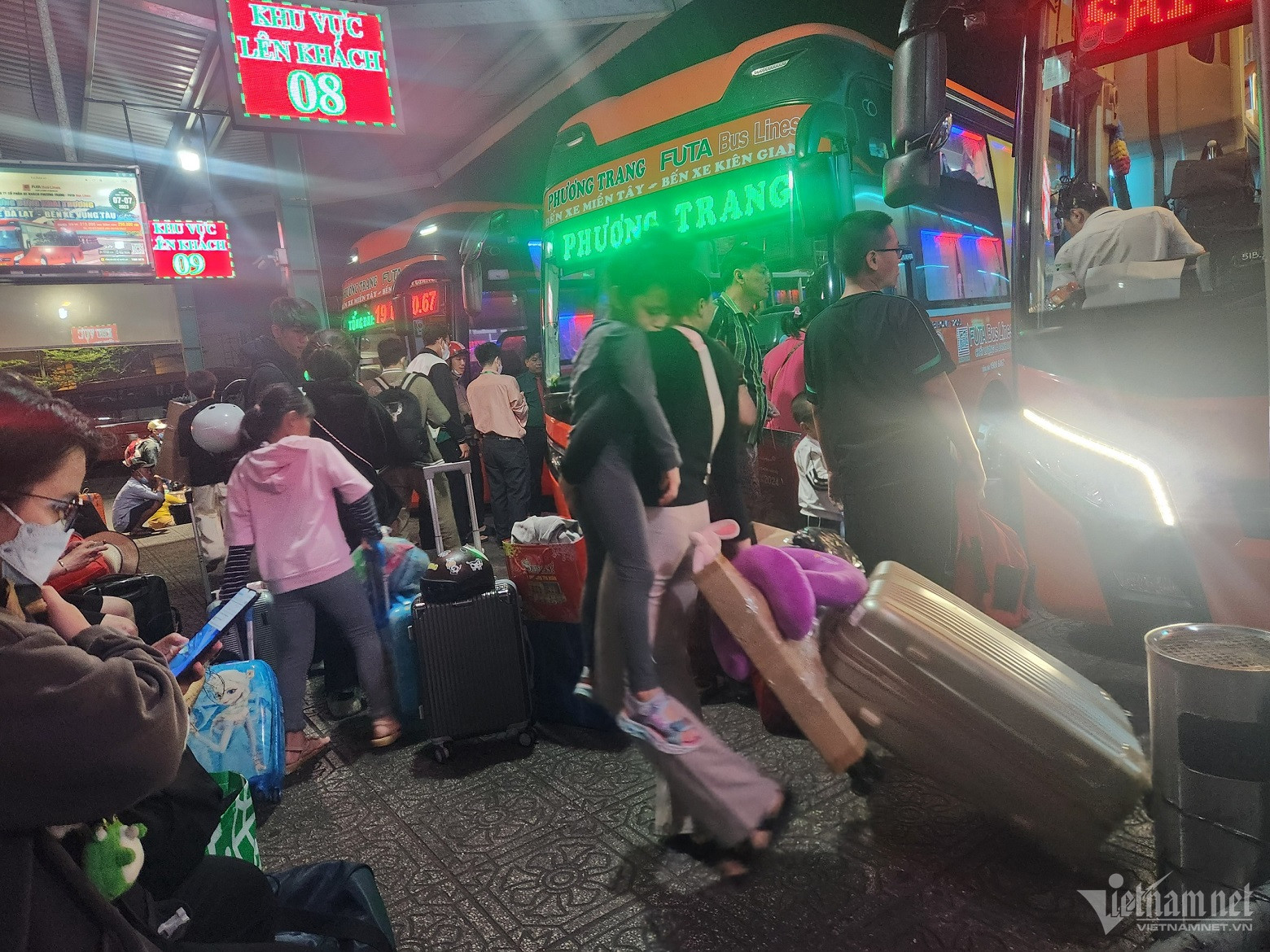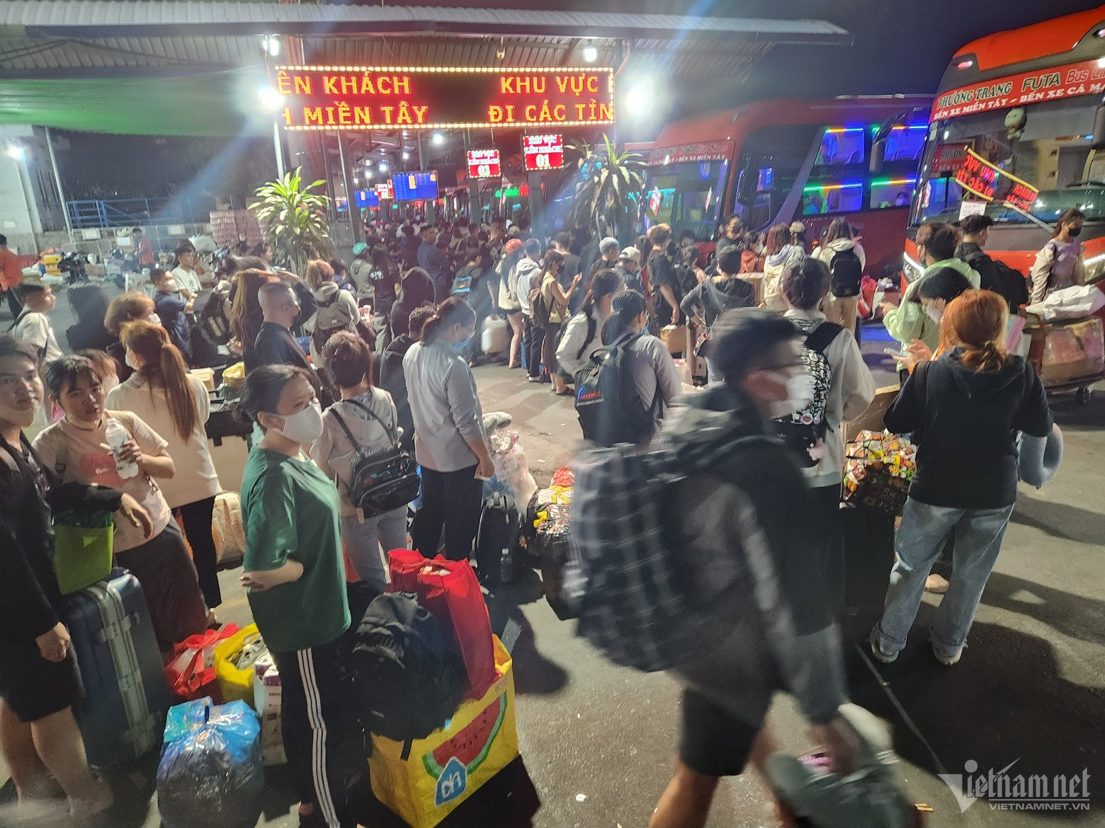 Khuya 6/2, nhằm ngày 27 tháng Chạp, bến xe Miền Tây chật cứng hành khách chờ lên xe về quê nghỉ TếtHành khách với đồ đạc lỉnh kỉnh đứng chờ kín bến xe Miền Tây.