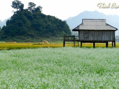 | Những ngôi nhà sàn và những ruộng lúa vàng sắp gặt càng làm nổi bật màu cải trắng thơ ngây |