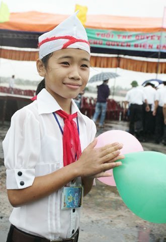 Dù mưa gió, các em học sinh vẫn háo hức đón những anh hùng thủy thủ tàu không số bên bờ sông Gianh
