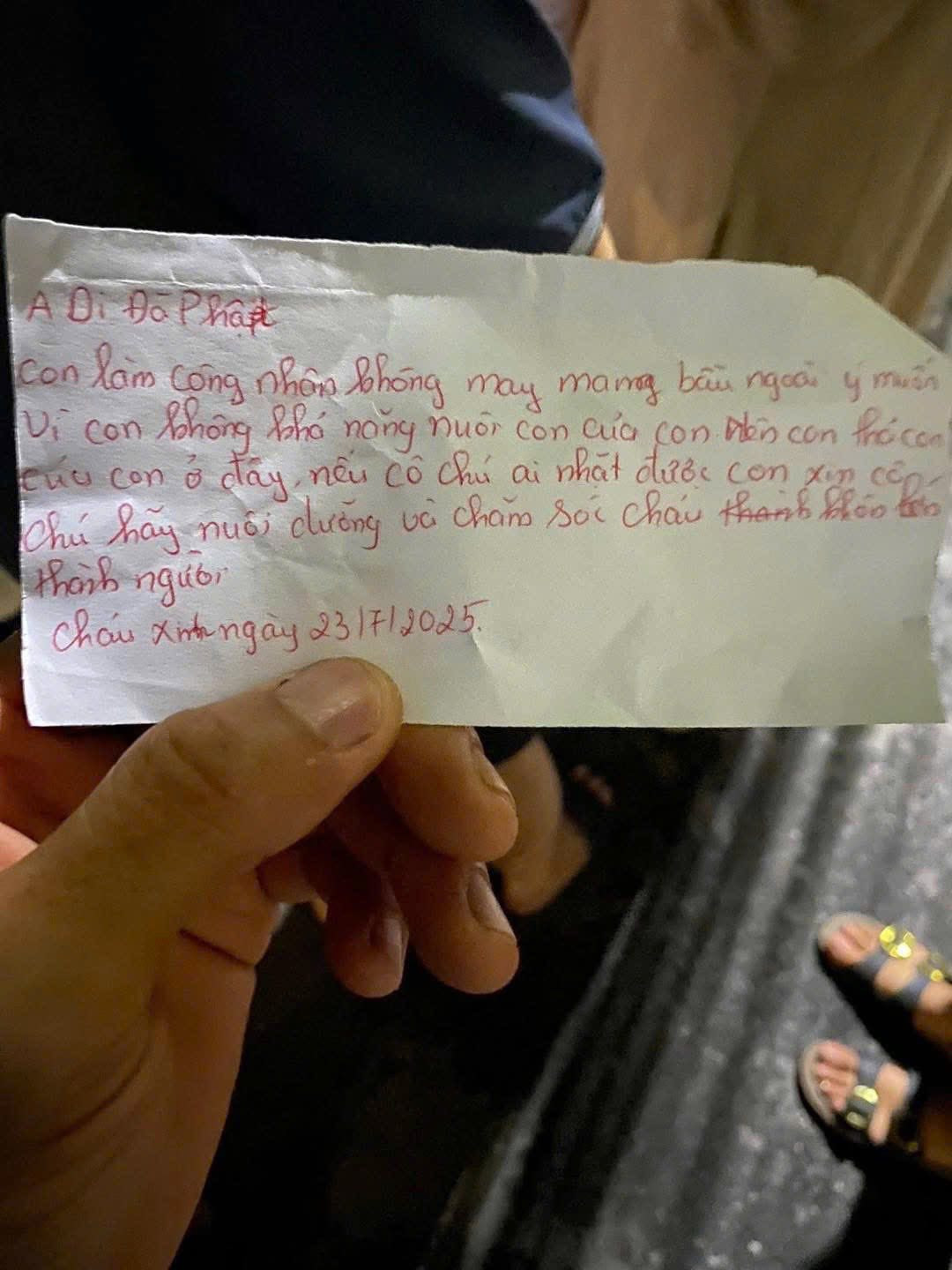Trên giấy ghi lại những dòng chữ nhắn nhủ đầy xót xa: "Con làm công nhân không may mang bầu ngoài ý muốn. Vì con không có khả năng nuôi con của con nên con thả con của con ở đây. Nếu cô chú nhặt được con của con, xin cô chú hay nuôi dưỡng cháu khôn lớn, thành người. Con sinh ngày 23/7/2025".