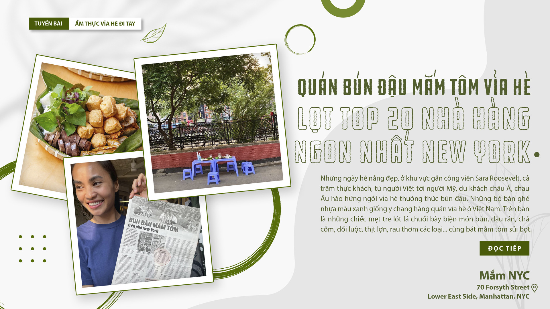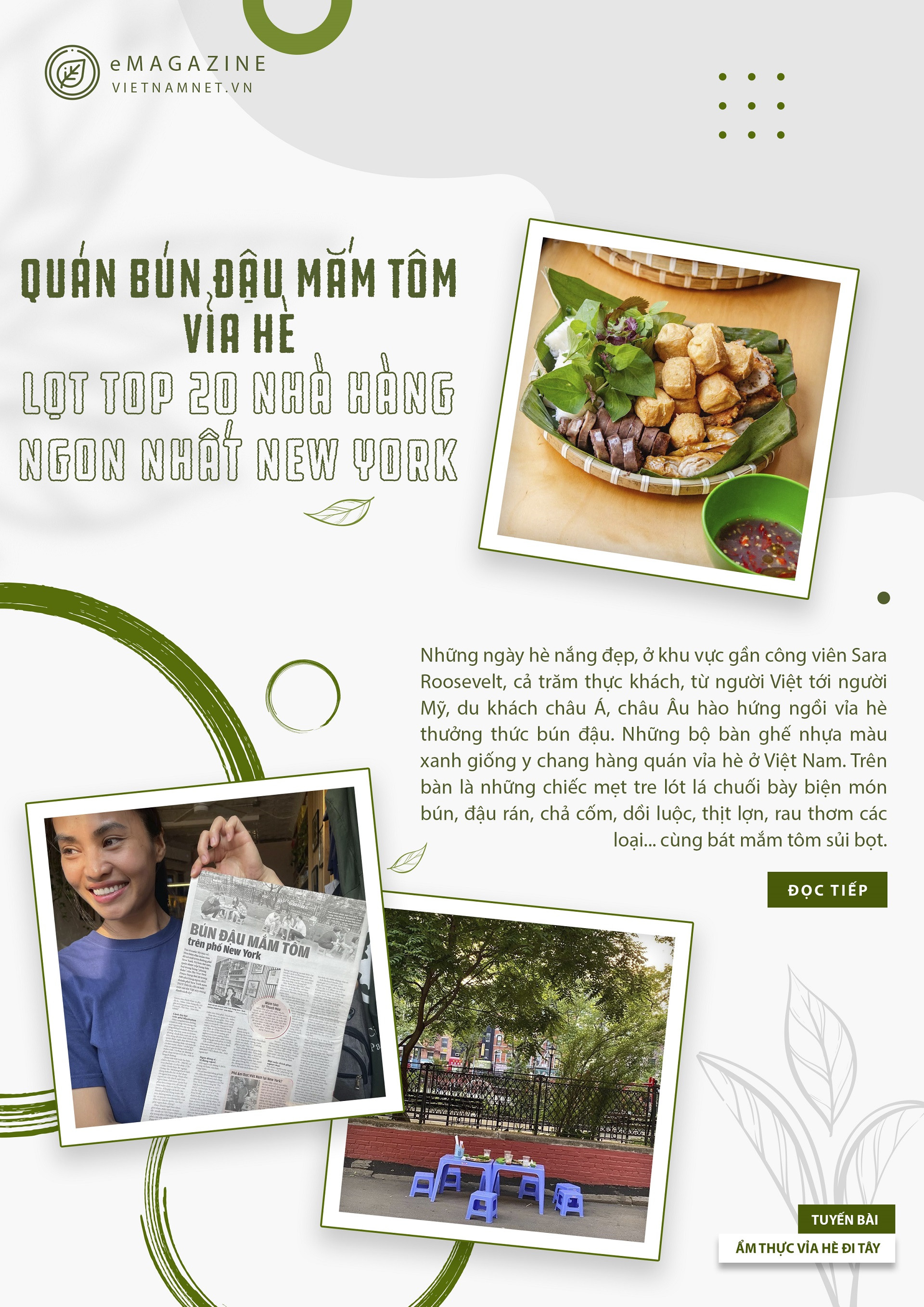 Những ngày hè nắng đẹp, ở khu vực gần công viên Sara Roosevelt, cả trăm thực khách, từ người Việt tới người Mỹ, du khách châu Á, châu Âu hào hứng ngồi vỉa hè thưởng thức bún đậu. Những bộ bàn ghế nhựa màu xanh giống y chang hàng quán vỉa hè ở Việt Nam. Trên bàn là những chiếc mẹt tre lót lá chuối bày biện món bún, đậu rán, chả cốm, dồi luộc, thịt lợn, rau thơm các loại... cùng bát mắm tôm sủi bọt.