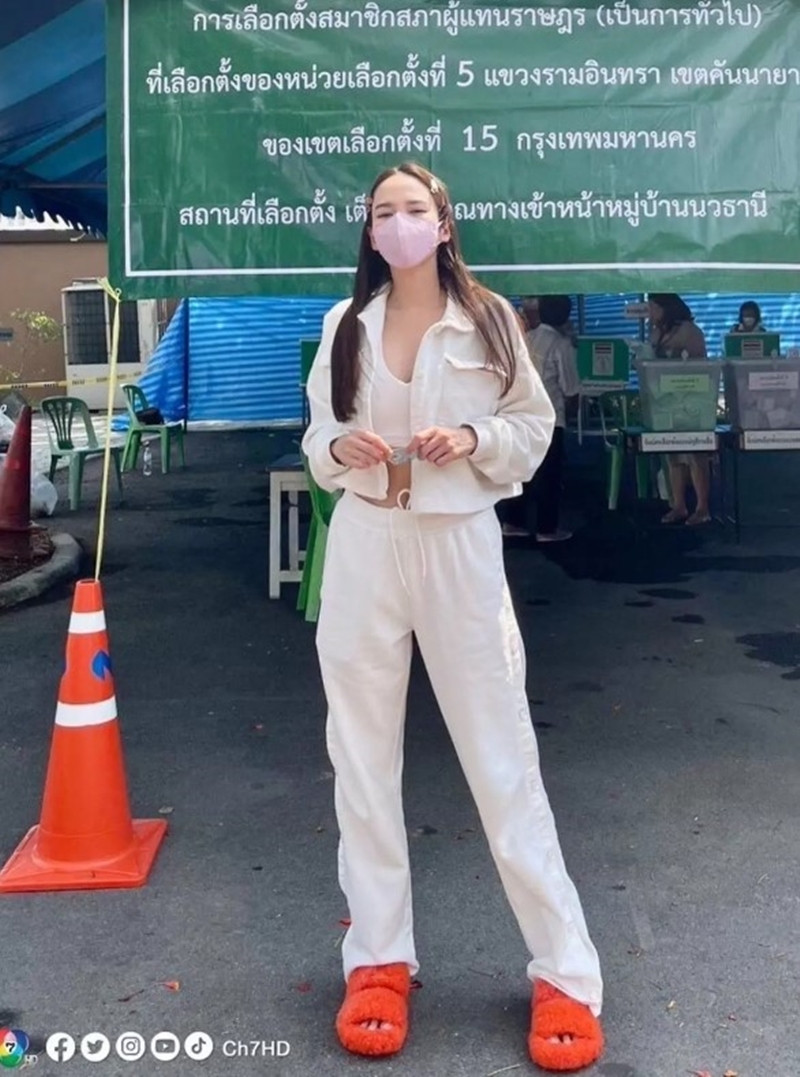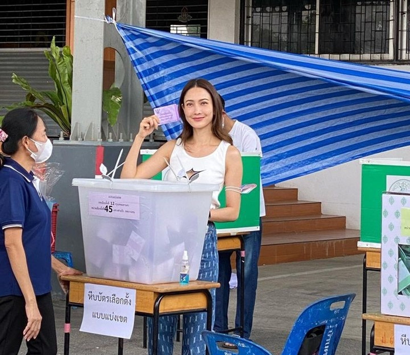 Nam ca sĩ BamBam - thành viên nhóm nhạc nổi tiếng Got7 - cùng mẹ đến nơi bầu cử.Diễn viên Baifern Pimchanok ăn mặc giản dị cùng gia đình tham gia bầu cử. Cô nổi tiếng với nhiều tác phẩm ăn khách như: 'Chiếc lá cuốn bay', 'Tình yêu sét đánh', 'Lừa đểu gặp lừa đảo' và đặc biệt là 'Yêu nhầm bạn thân' đóng cặp với bạn trai Nine Naphat.Nine Naphat cũng đã có mặt tại nơi bỏ phiếu. Anh được biết đến qua phim điện ảnh ăn khách 'Yêu nhầm bạn thân' năm 2019. Gần đây, người hâm mộ phấn khích khi anh và Baifern công khai hẹn hò.Nữ chính phim ‘’Nữ thần rắn’’ Taew Natapohn cũng đã có mặt từ sớm. Cô được biết đến qua nhiều bộ phim nổi tiếng như 'Ánh dương tình yêu', 'Trò chơi tình ái', 'Ngọn lửa kiêu hãnh'. Taew mất điểm với công chúng sau khi chia tay bạn trai 14 năm rồi quen đại gia ngay sau đó.Nữ minh tinh 'Ngược dòng thời gian để yêu anh' Bella Ranee thu hút mọi ánh nhìn khi xuất hiện tại nơi bỏ phiếu. Cô là diễn viên độc quyền của đài CH3. Với diễn xuất ấn tượng, Bella đã ghi dấu ấn với khán giả qua nhiều tác phẩm như: 'Chiêu trò lừa gạt', 'Lồng nghiệp chướng'. Người hâm mộ vui mừng khi phần tiếp theo của phim 'Ngược dòng thời gian để yêu anh' đang trong giai đoạn bấm máy.Bee Namthip cũng đã xuất hiện tại buổi bầu cử. Cô nổi tiếng với trò huấn luyện viên của chương trình “The Face Thailand”. Patcharapa có mặt tại nơi bầu cử. Cô gây sốt với diễn xuất ấn tượng qua loạt phim như: 'Cặp bẫy hoàng quang', 'Chị ơi! Anh yêu em'. Mới đây, cô gây xôn xao dư luận sau khi chia tay bạn trai vì sự xuất hiện của người thứ 3.Nam diễn viên 'Tuổi nổi loạn' March Chatawut mặc quần bò, áo phông đi bầu cử. Anh có kinh nghiệm diễn xuất hơn 10 năm với hơn 40 tác phẩm lớn nhỏ khác nhau. Anh là bạn thân của diễn viên Baifern.