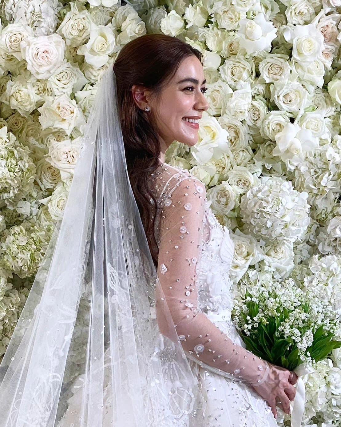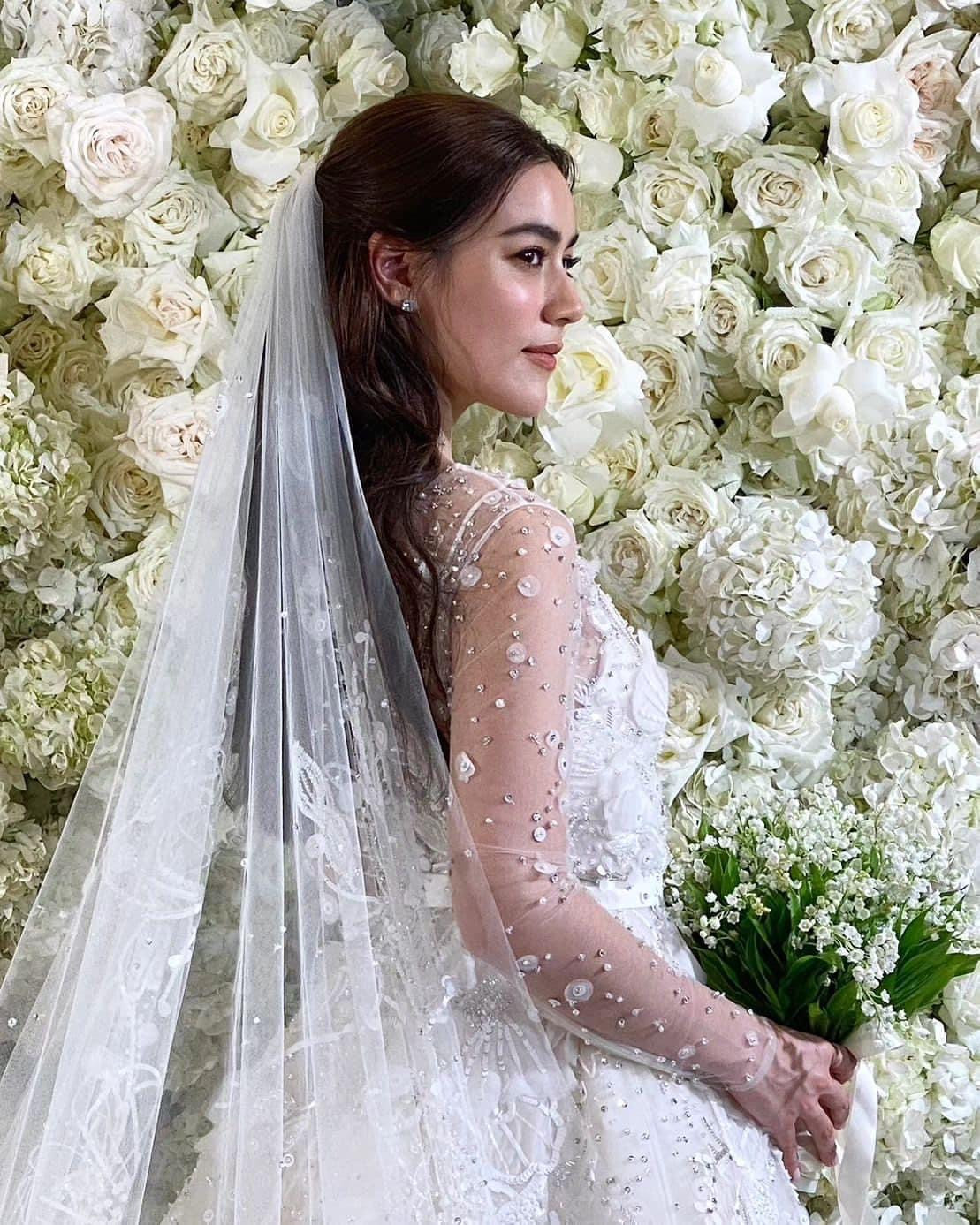 Cô dâu Kimmy Kimberley chọn phong cách trang điểm nhẹ nhàng, trong veo. Nữ diễn viên diện chiếc váy cưới lộng lẫy với đường may tinh tế, điểm nhấn sang trọng ở chất liệu pha ren đính kết tỉ mỉ.