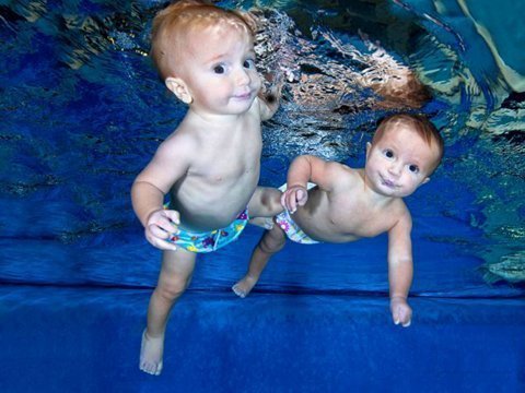 Hai bé thích nhoài lưng tới lui và đạp chân để cơ thể di chuyển trên mặt nước.