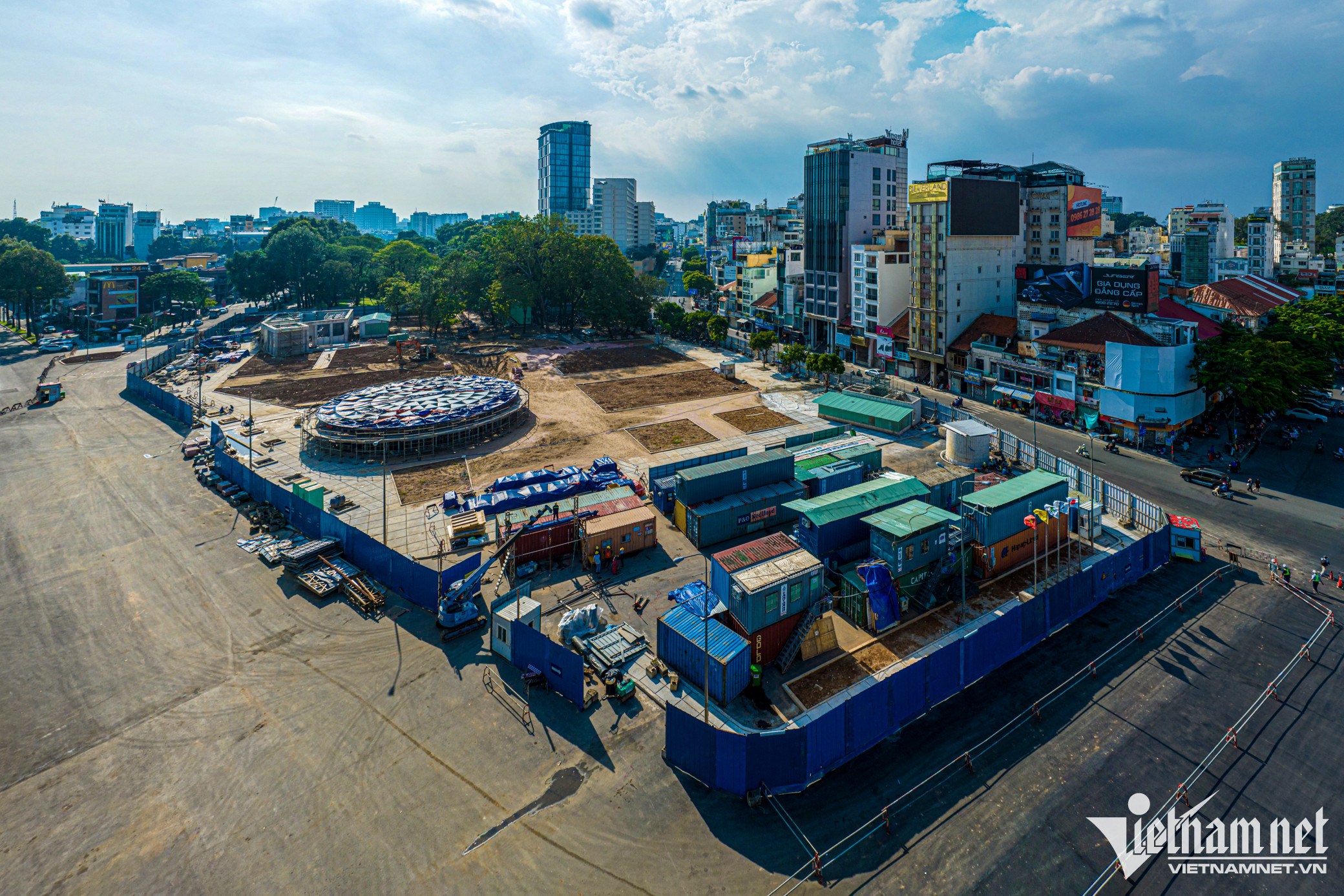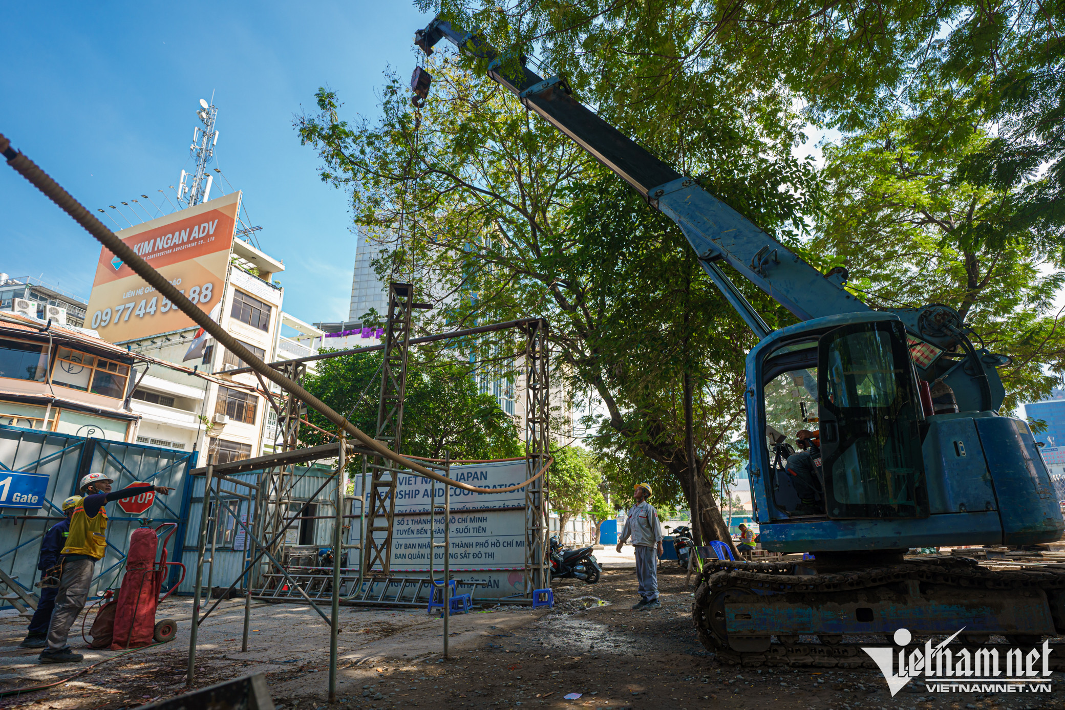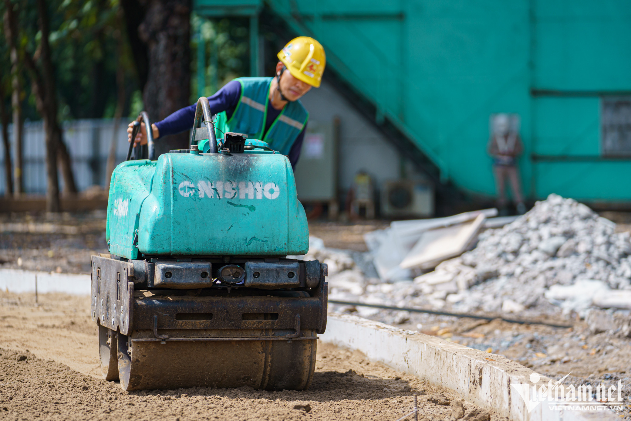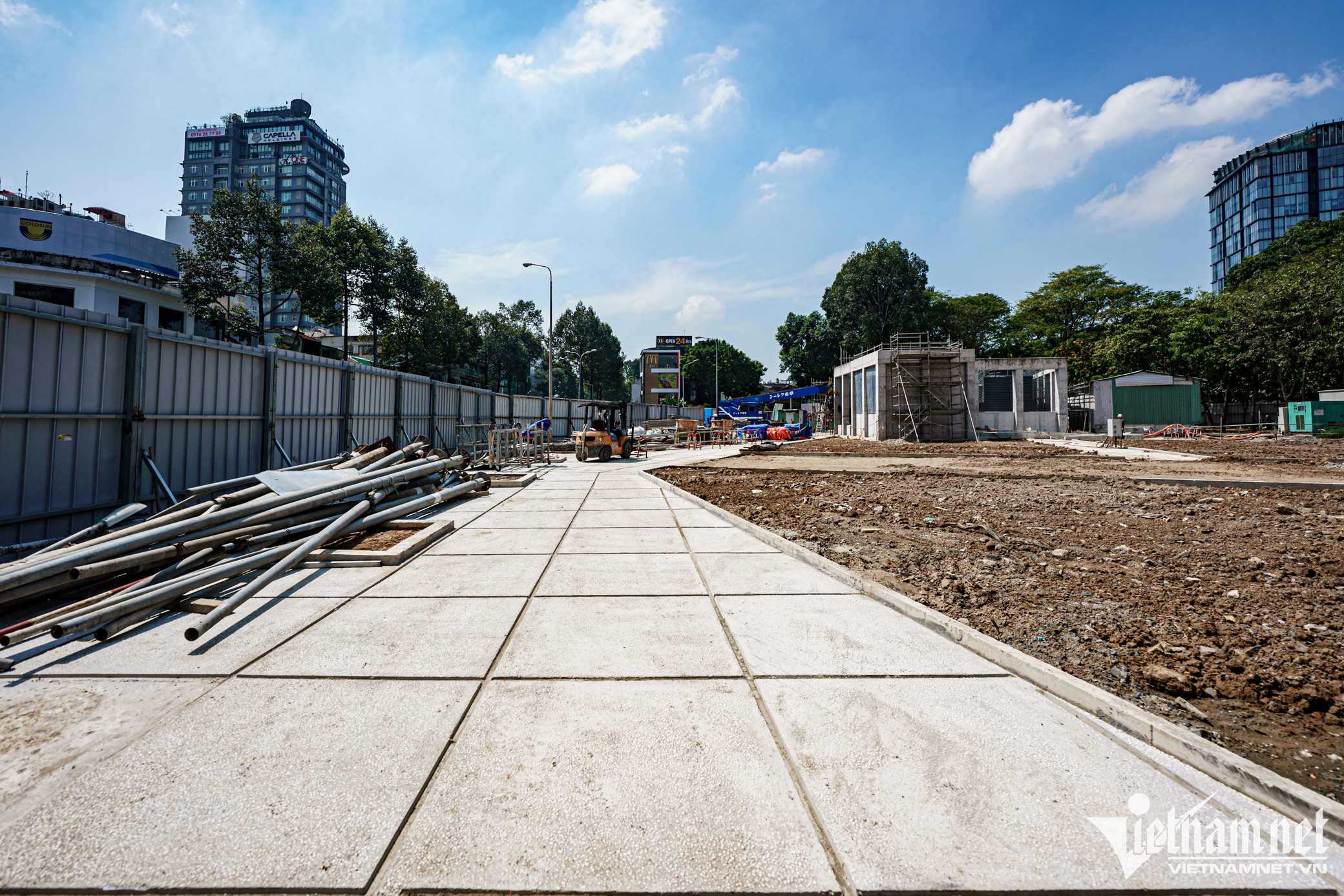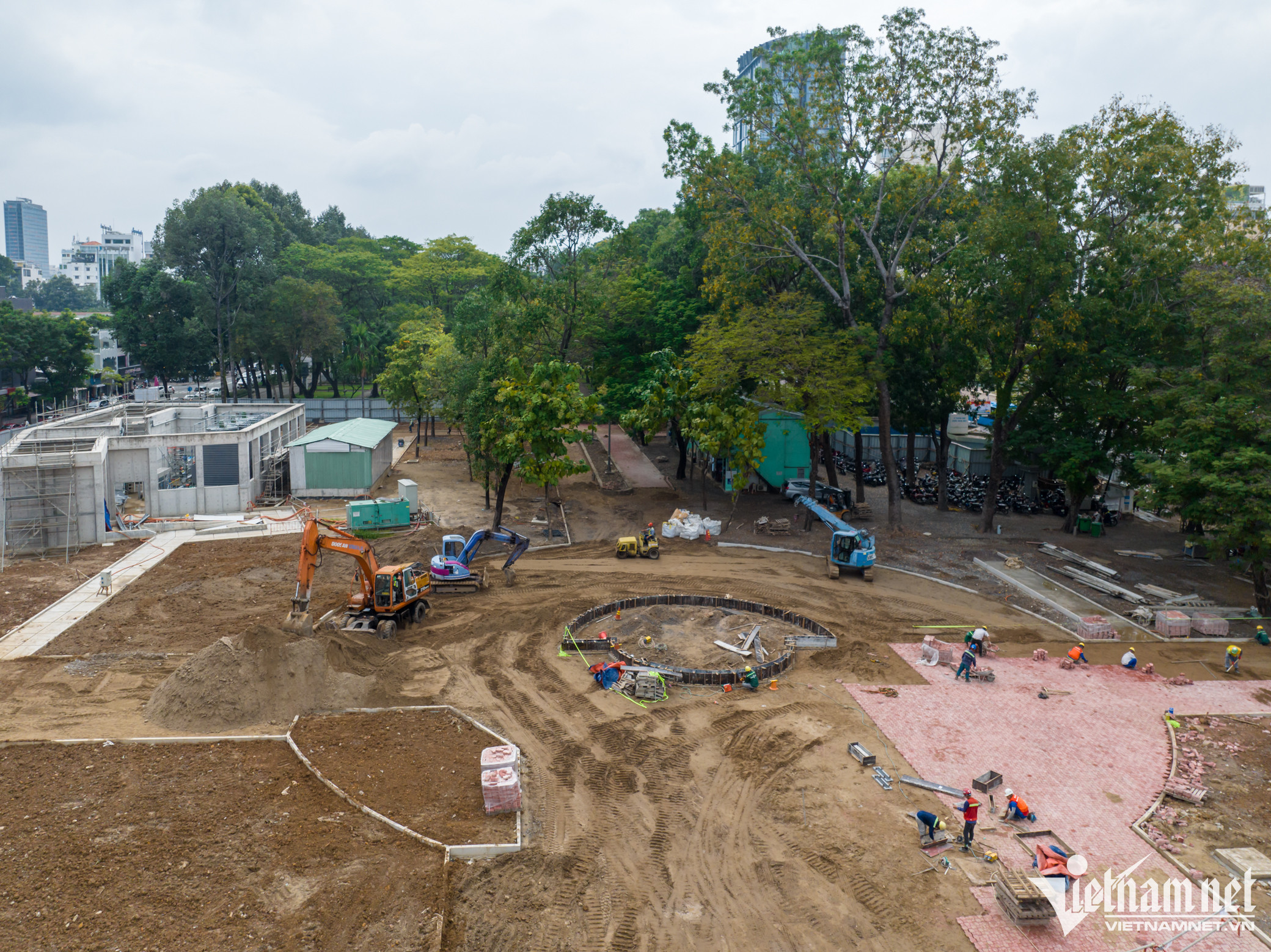 Hàng chục công nhân cùng xe lu, xe ủi và xe cẩu múc tất bật làm việc. Đơn vị thi công đang hình thành nền gạch, xây bồn cỏ, bồn cây,... Sau khi hoàn thiện phần cấu trúc, Công ty Công viên cây xanh TP.HCM sẽ tiến hành trồng lại 75 cây bị bứng và trải thảm cỏ, tạo mảng xanh thực vật. Cổng số 1 của công trường trên đường Lê Lai (quận 1) đã khóa chặt, mở lối đi khác cách đó 100m tại đoạn đã hoàn thiện phần vỉa hè thảm đá sỏi.