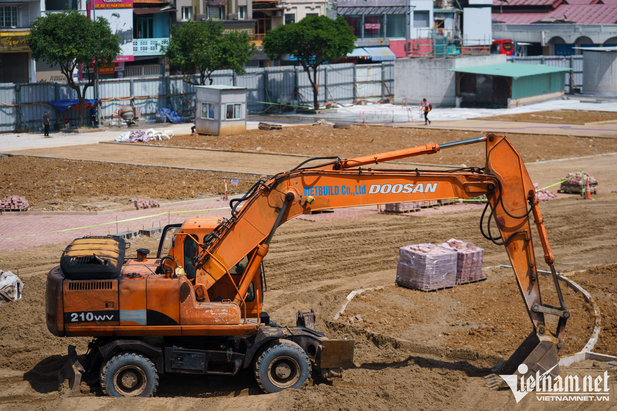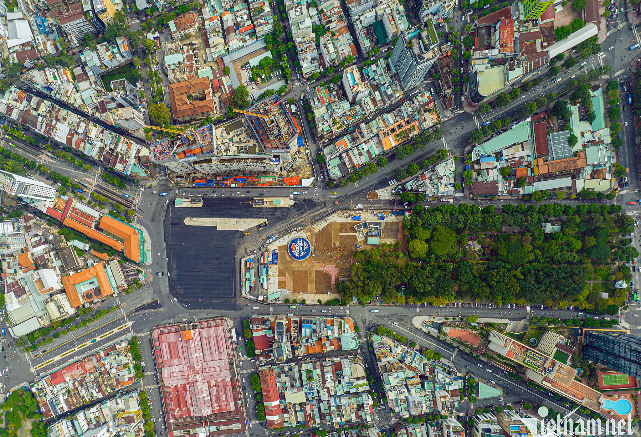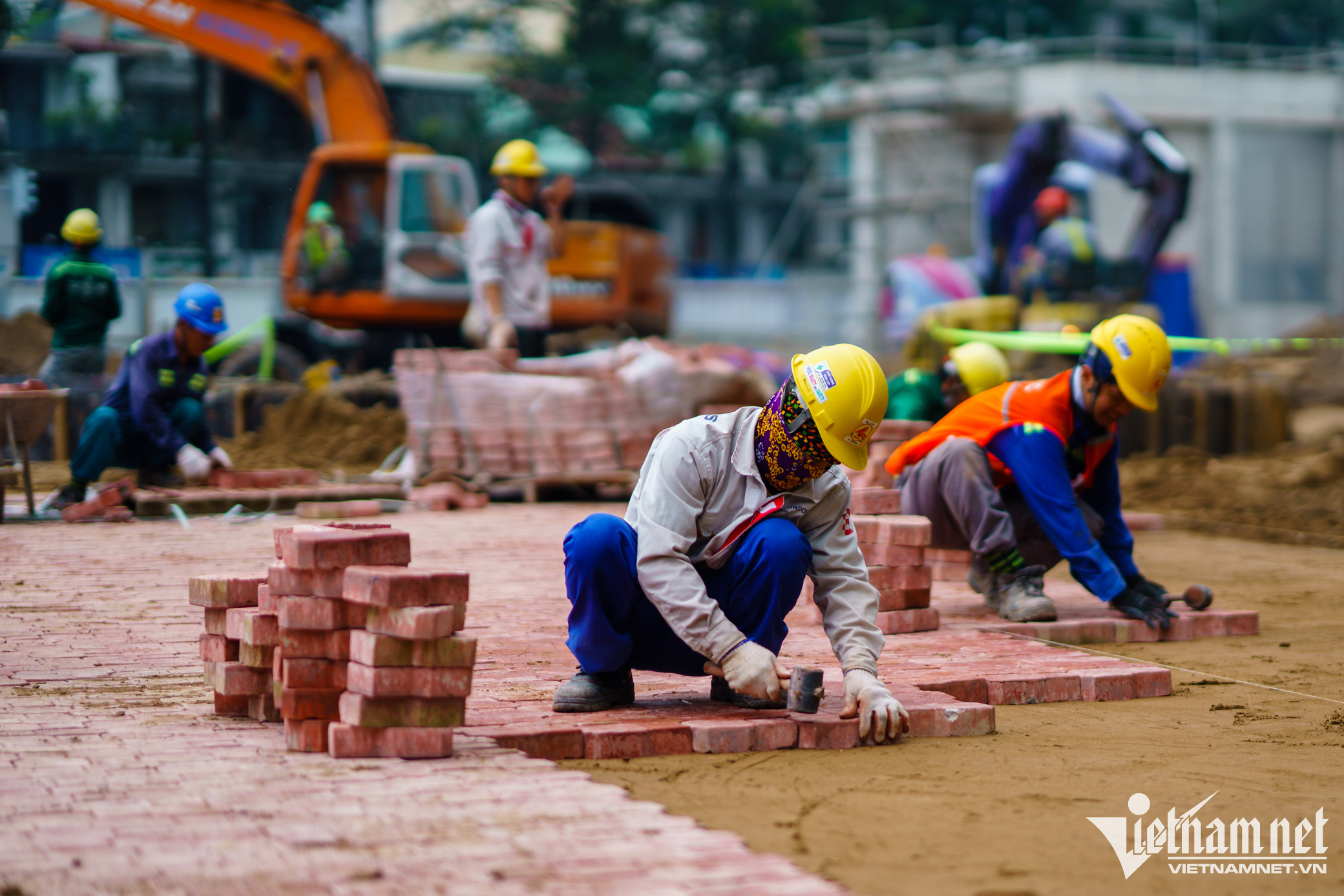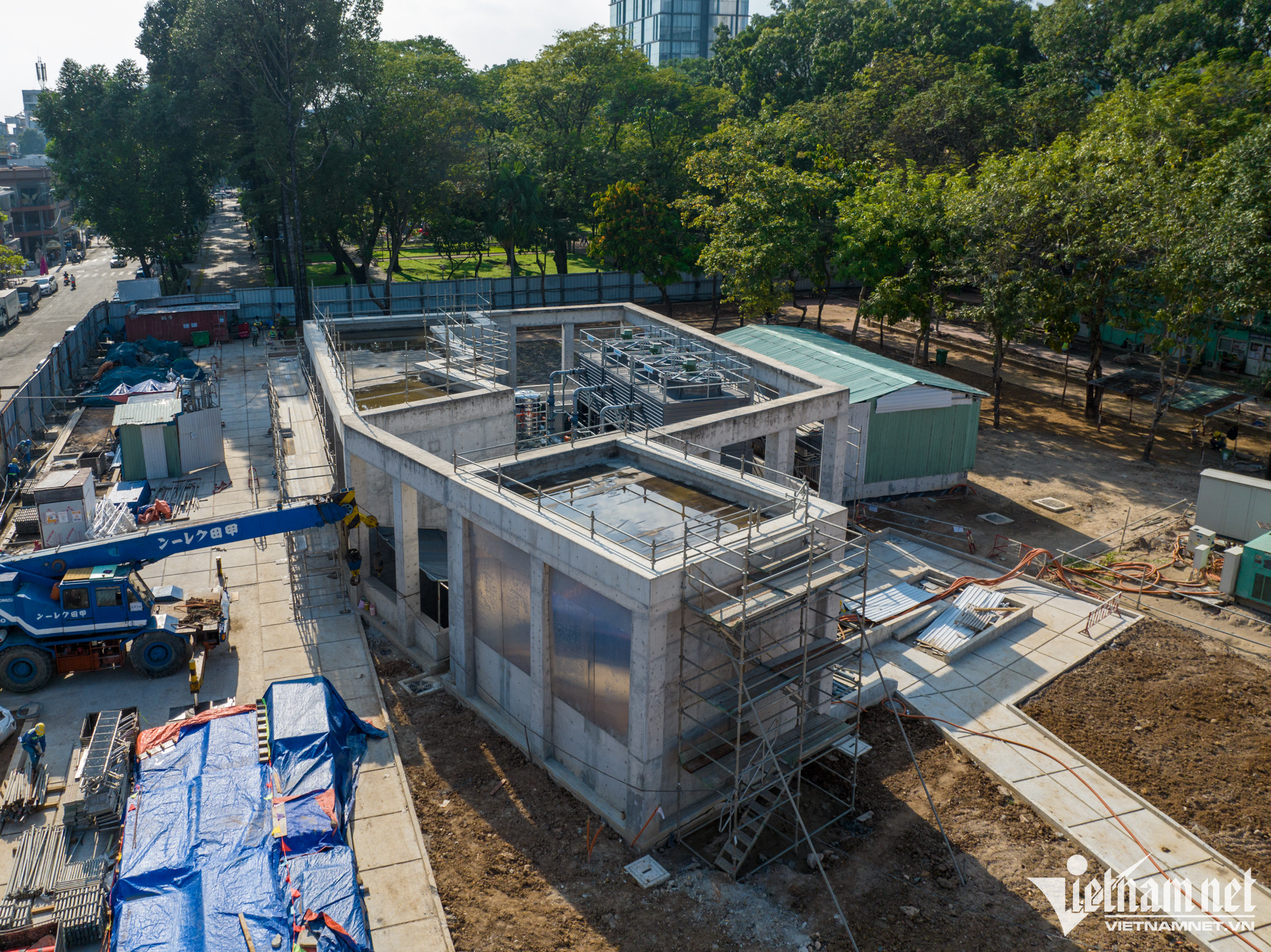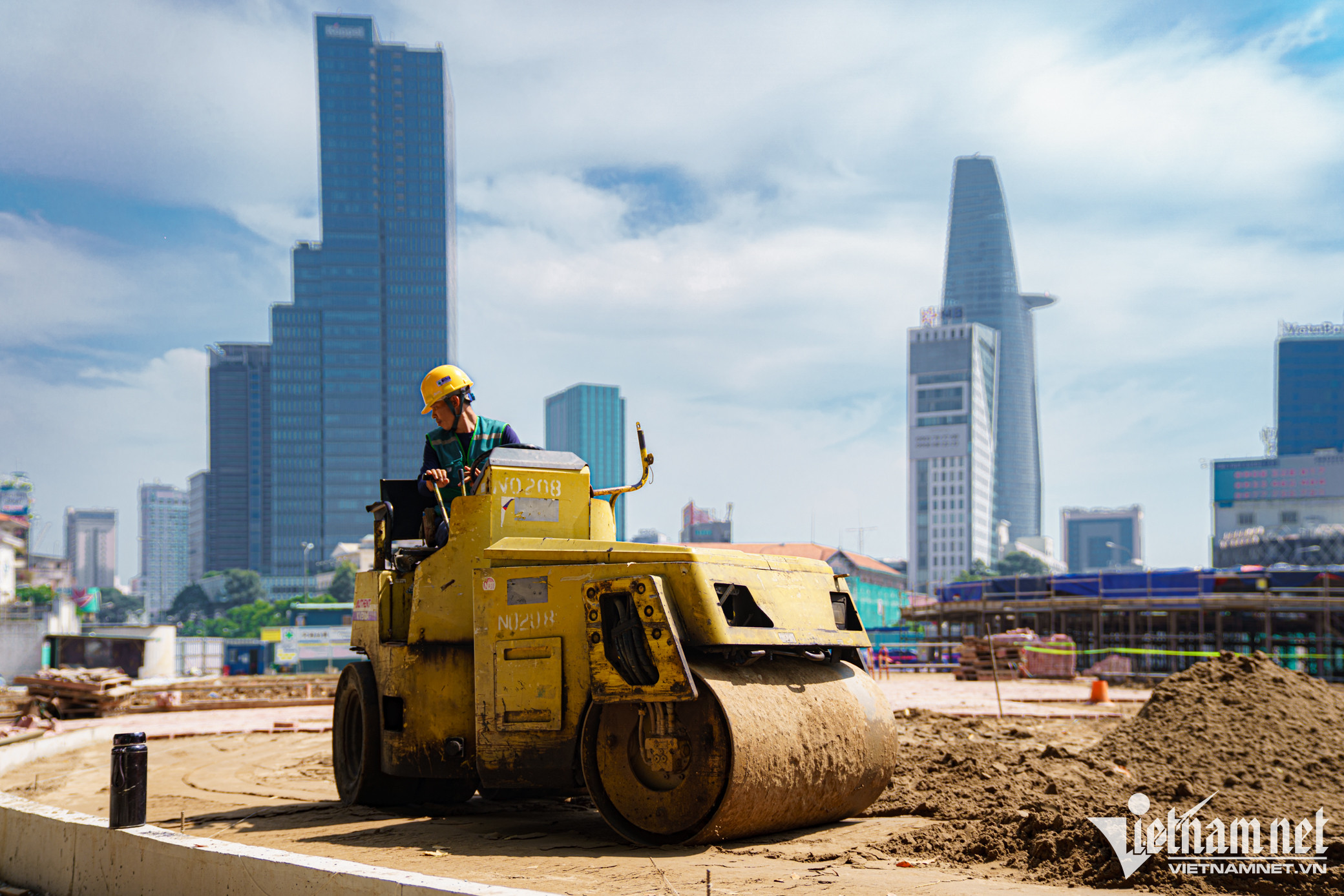 Hàng chục công nhân cùng xe lu, xe ủi và xe cẩu múc tất bật làm việc. Đơn vị thi công đang hình thành nền gạch, xây bồn cỏ, bồn cây,... Sau khi hoàn thiện phần cấu trúc, Công ty Công viên cây xanh TP.HCM sẽ tiến hành trồng lại 75 cây bị bứng và trải thảm cỏ, tạo mảng xanh thực vật. Cổng số 1 của công trường trên đường Lê Lai (quận 1) đã khóa chặt, mở lối đi khác cách đó 100m tại đoạn đã hoàn thiện phần vỉa hè thảm đá sỏi.