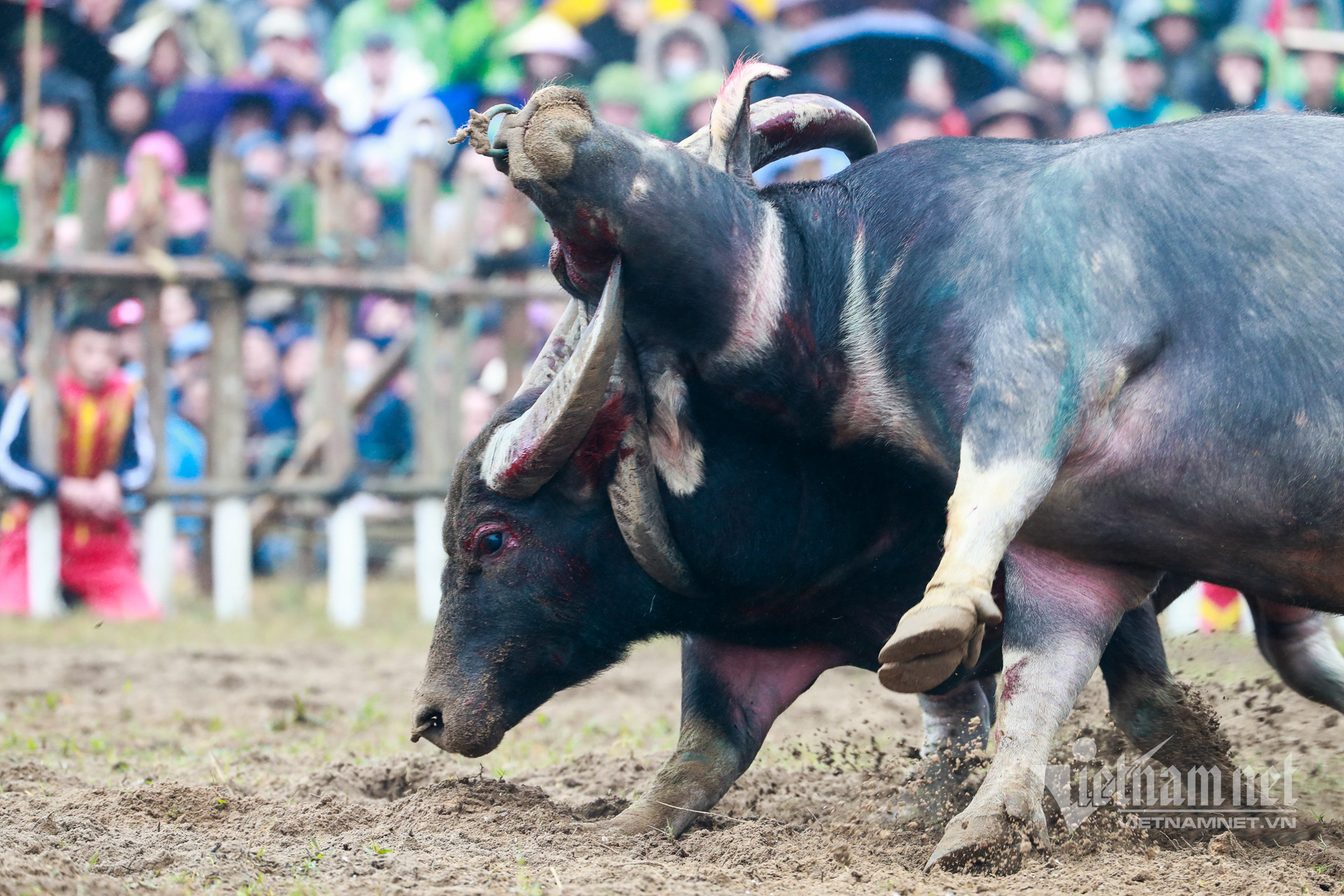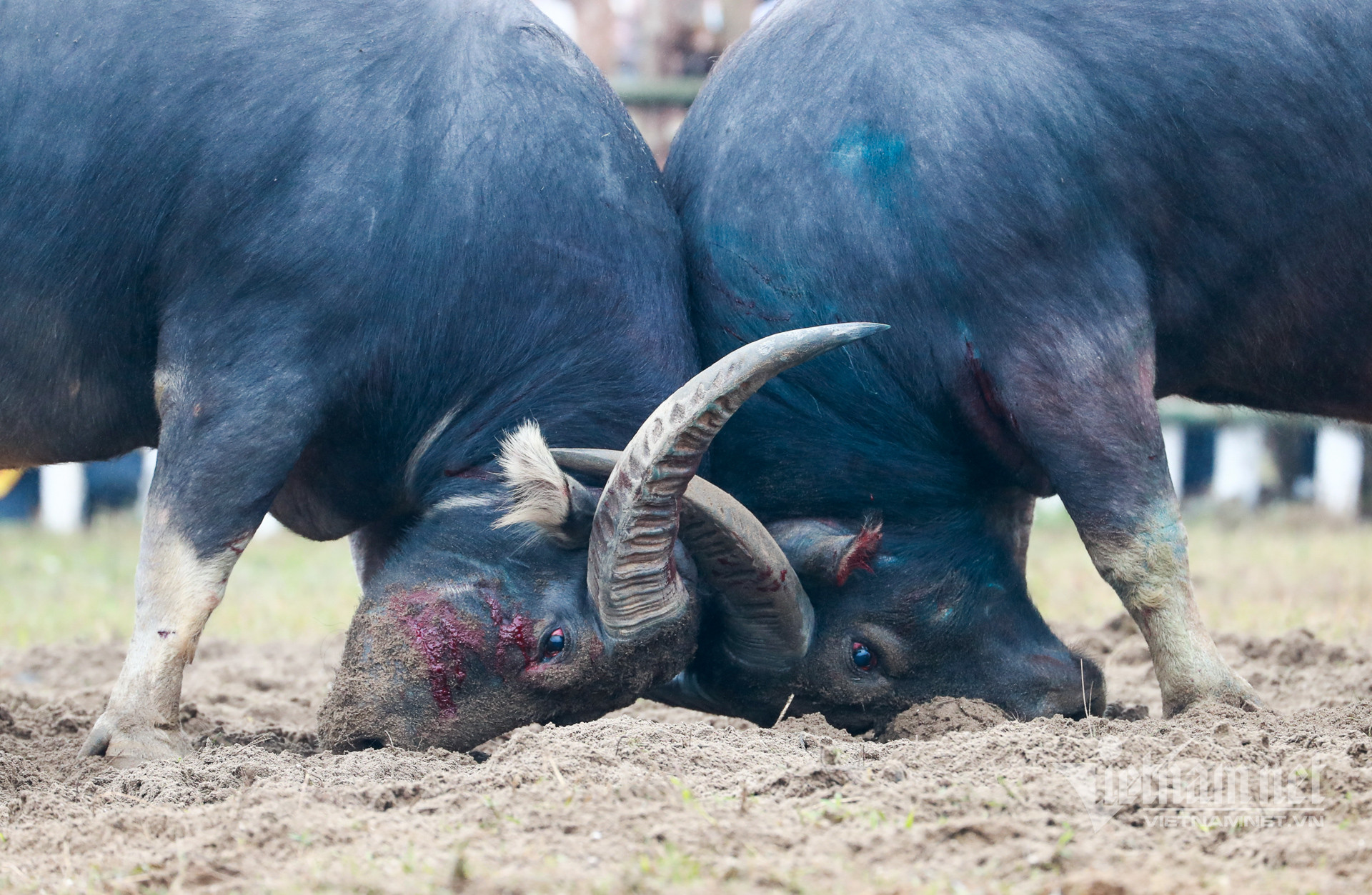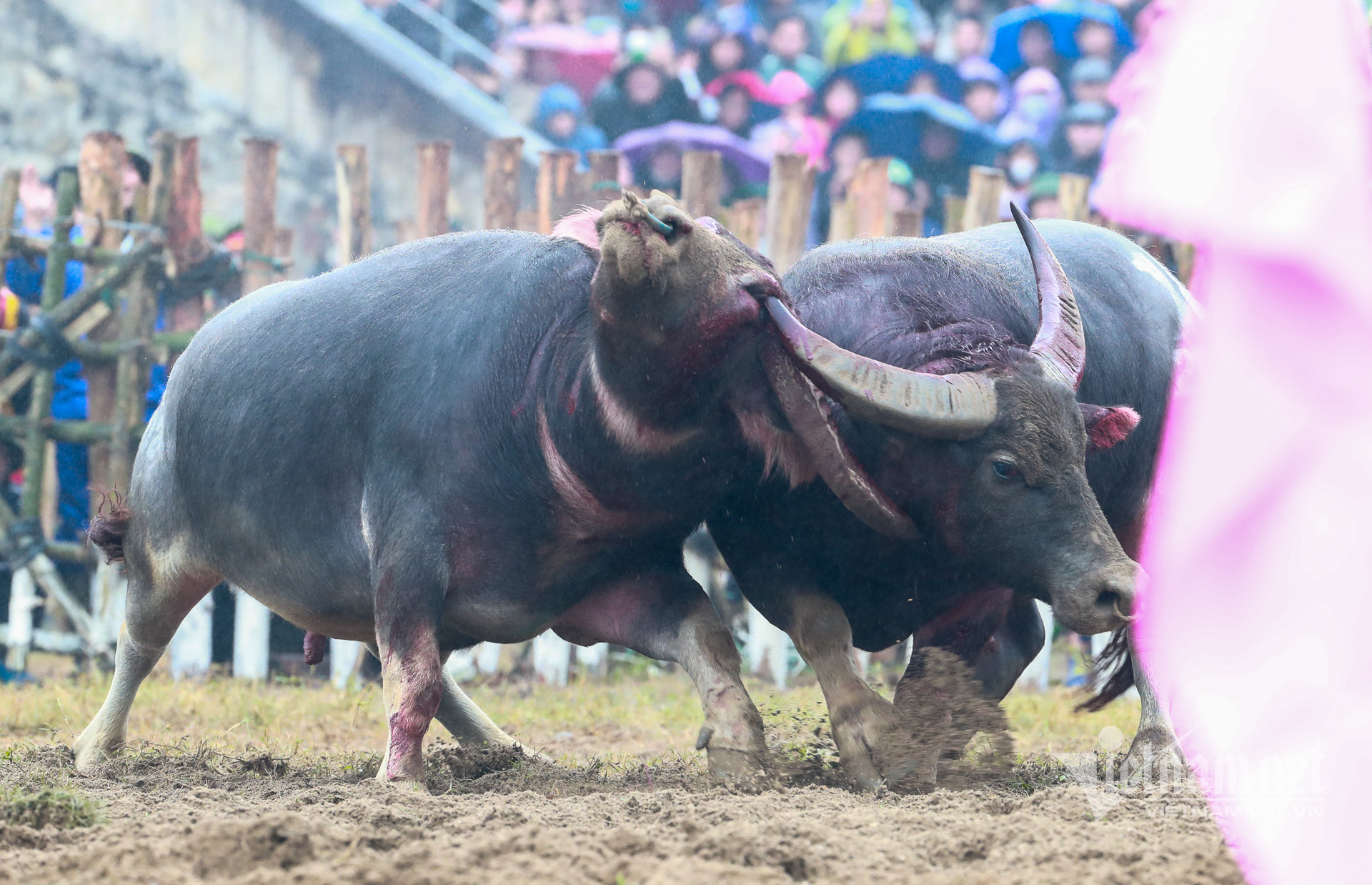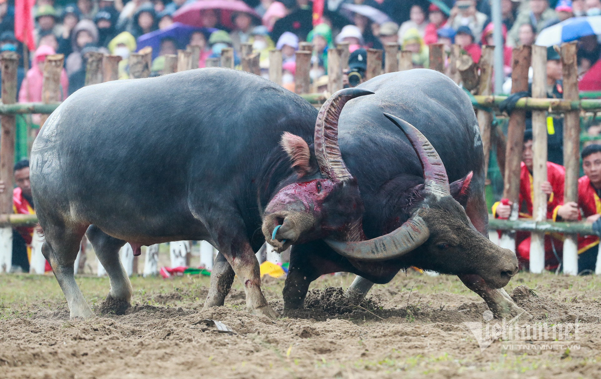 Trong ngày cuối cùng diễn ra các trận chung kết, dù trời mưa, trên hàng ghế khán giả vẫn không còn một chỗ trống. Ngay từ khi cặp đấu đầu tiên được dẫn dắt vào sân, tiếng hò reo cổ vũ đã vang lên không ngớt. Trong ảnh là trâu số 14 của ông Dương Văn Hải. Chủ trâu đã rất vất vả để đưa được "ông cầu" vào sân thi đấu.Cặp đấu đáng chú ý nhất là trâu số 15 và 13. Ngay sau khi vào sân ít phút, trâu 15 có cú móc sừng vào yết hầu trâu 13 tạo nên sự kích tính hấp dẫn. Với nhiều đòn hóc hiểm, trâu số 15 (của ông Nguyễn Tiến Cự) sau đó giành phần thắng lọt vào vòng bán kết.