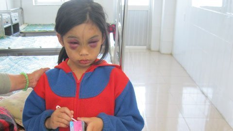Các vết thương trên mặt cháu Thục Phi sau khi bị cha mẹ nuôi đánh đập, hành hạ.