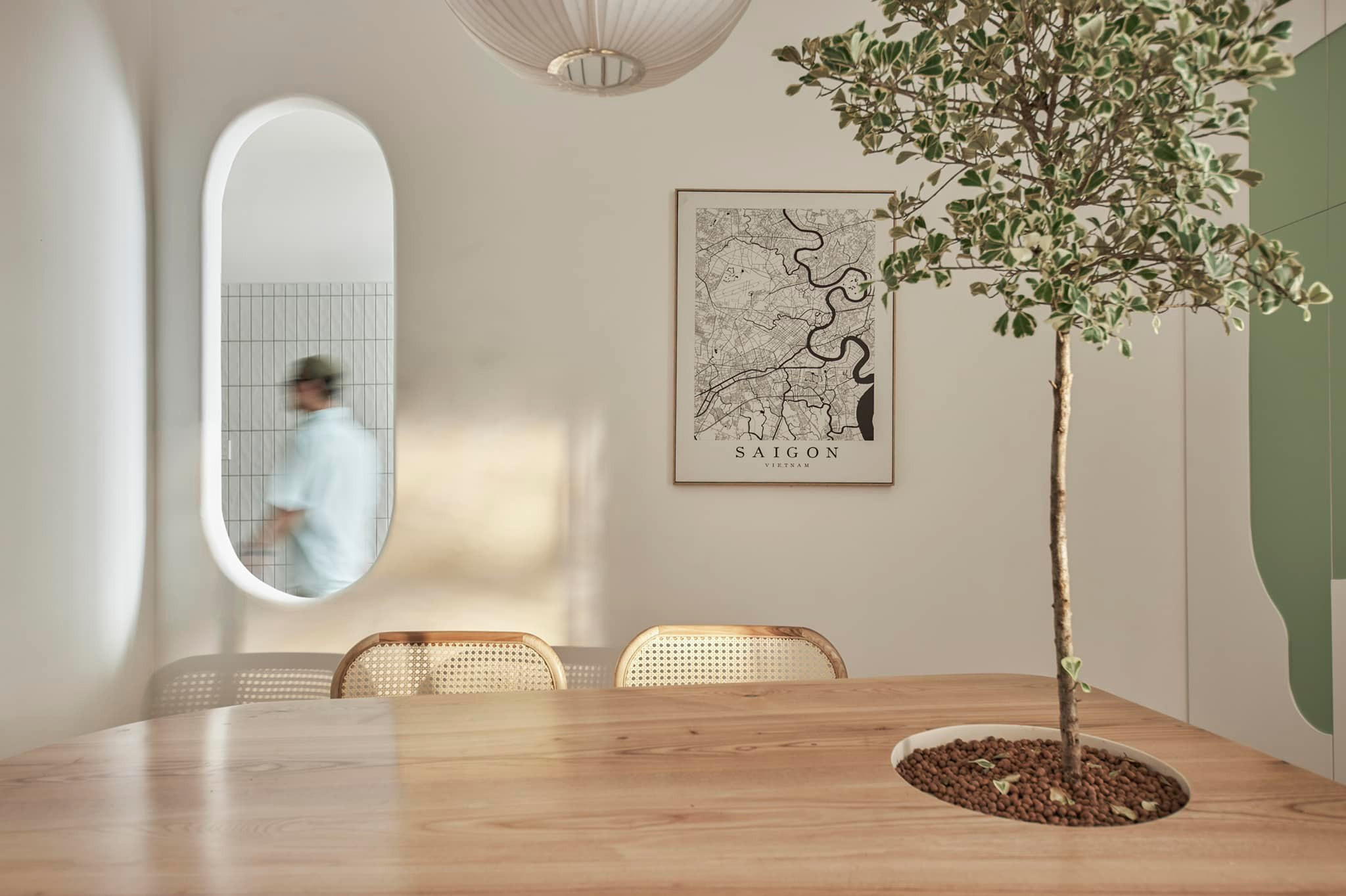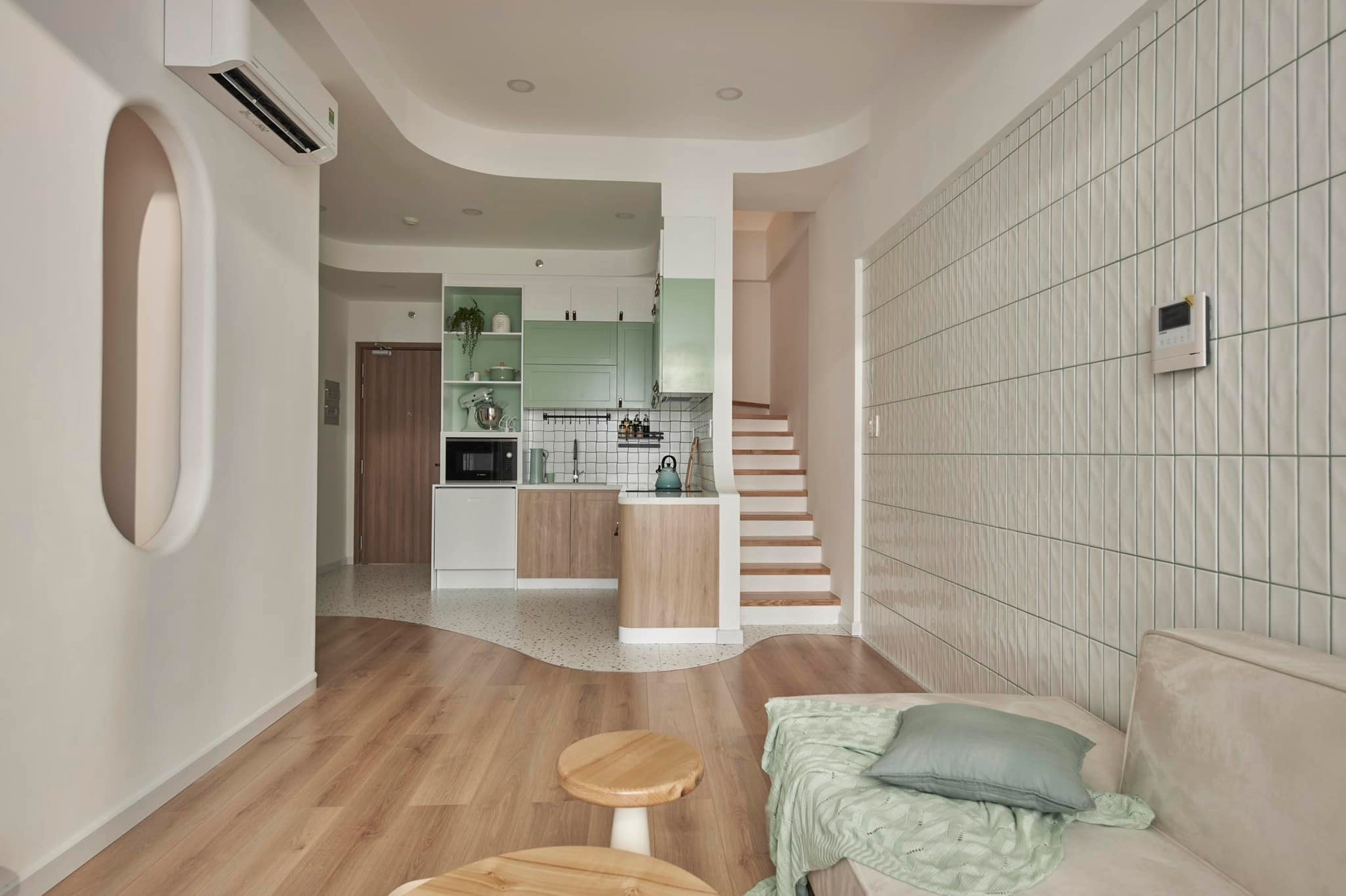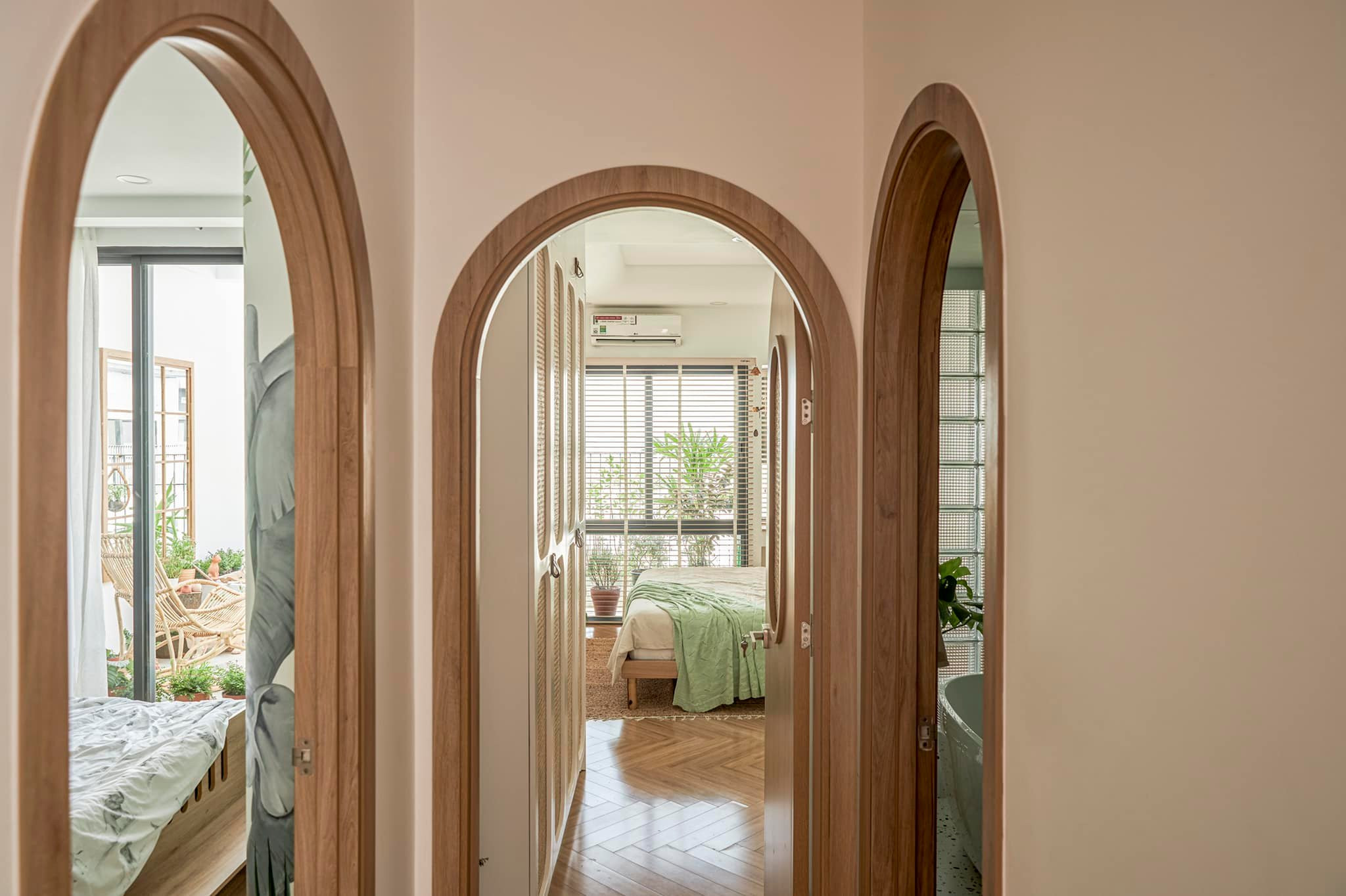 Thực tế trên thiết kế đây là 1 phòng ngủ nữa, nhưng chị đập thông và bỏ hẳn cửa phòng, chỉ để cái khung cửa bo cong để làm không gian thoáng đãng hơn và tạo sự kết nối giữa các phòng.