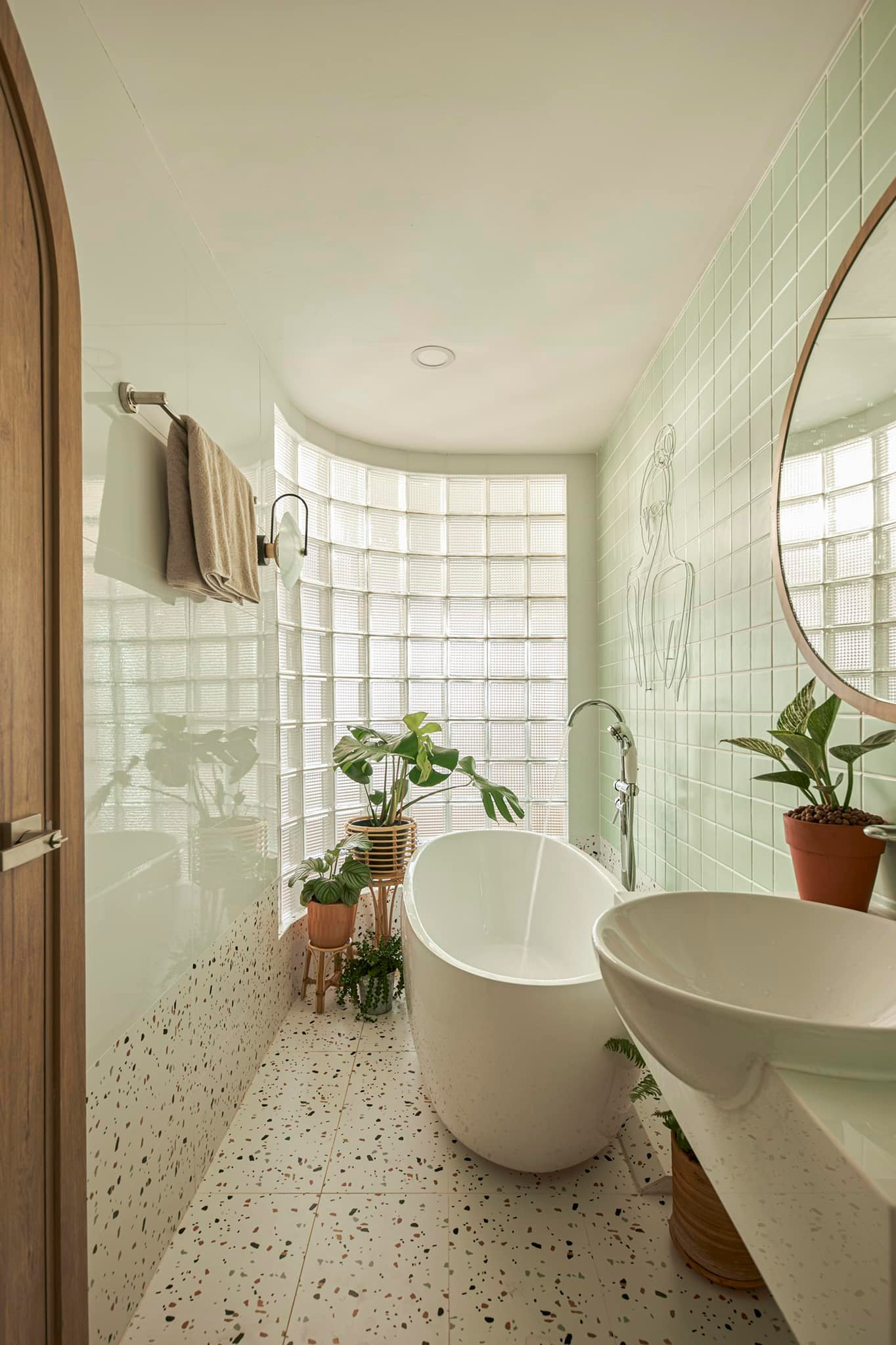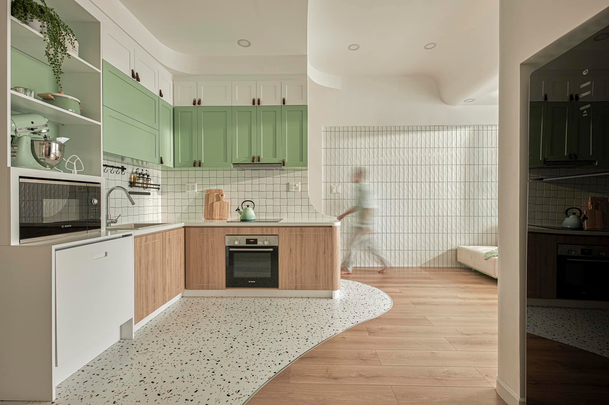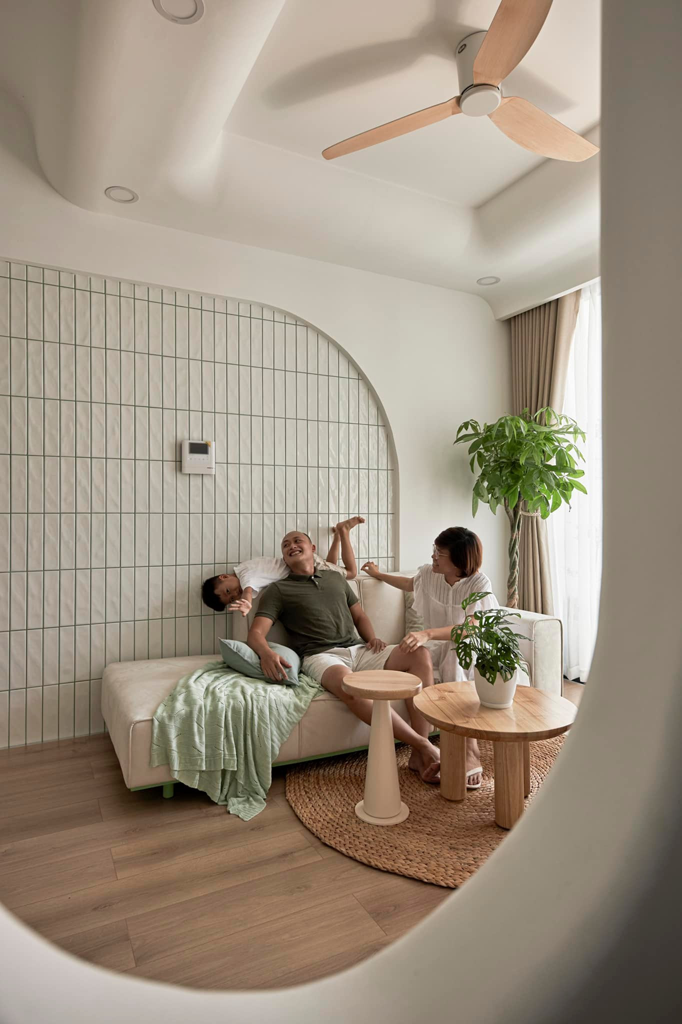 Thực tế trên thiết kế đây là 1 phòng ngủ nữa, nhưng chị đập thông và bỏ hẳn cửa phòng, chỉ để cái khung cửa bo cong để làm không gian thoáng đãng hơn và tạo sự kết nối giữa các phòng.