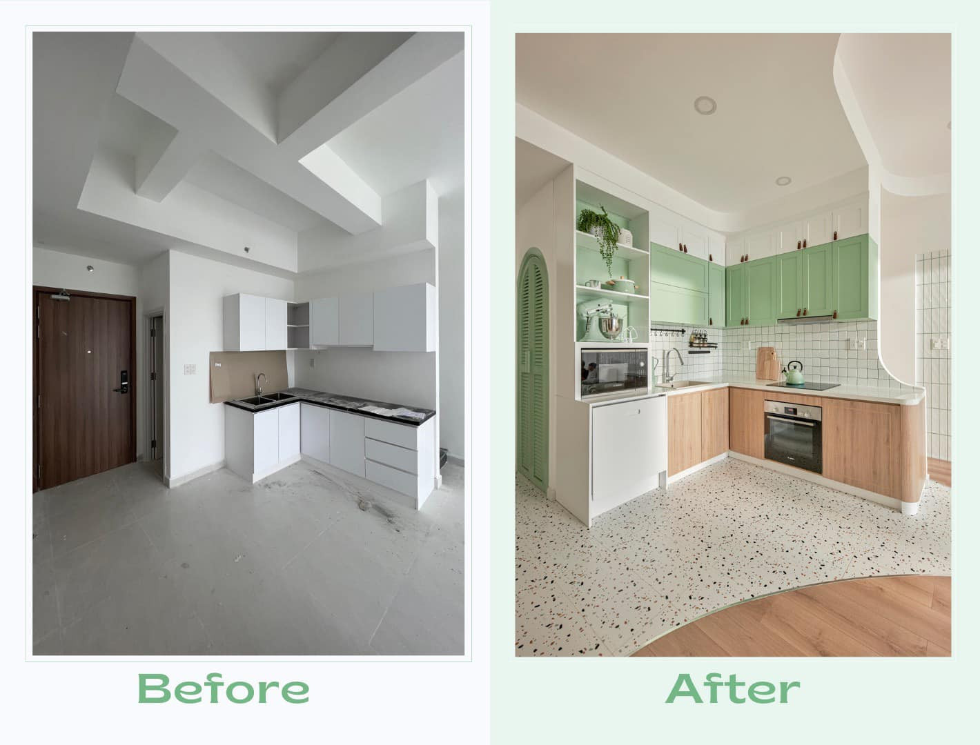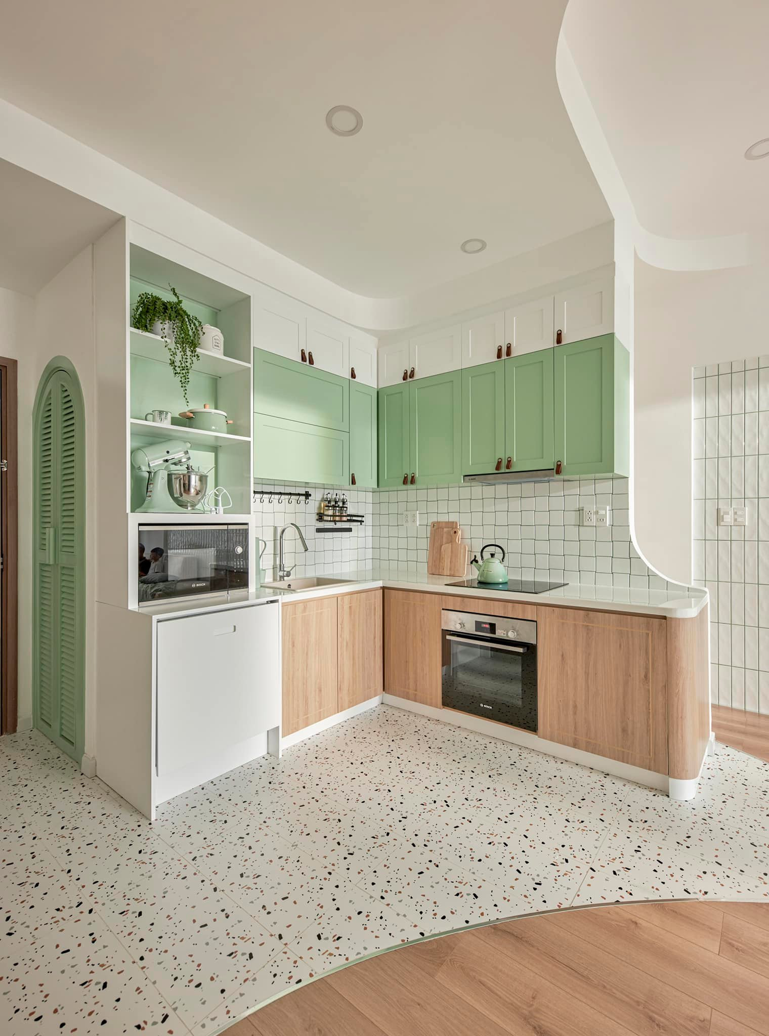 Lúc đầu cửa kho mở vào bên trong, khiến diện tích đựng đồ bị thu hẹp vì vướng chỗ mở cửa. Gia chủ đã thay đổi cửa nhà kho bằng 2 cánh mở ra phía ngoài, cửa cong lá sách kiểu truyền thống. Bên trong chị đặt kệ giày, kệ đựng vật dụng, máy hút, chổi, và một số đồ ít sử dụng. Trần nhà không được thẩm mỹ, vì chủ đầu tư chỉ dùng thạch cao vừa đủ che đường ống. Bếp cũng hơi nhỏ, chỗ chừa trống là để tủ lạnh, gia chủ cho làm lại toàn bộ hệ tủ bếp để phù hợp hơn.