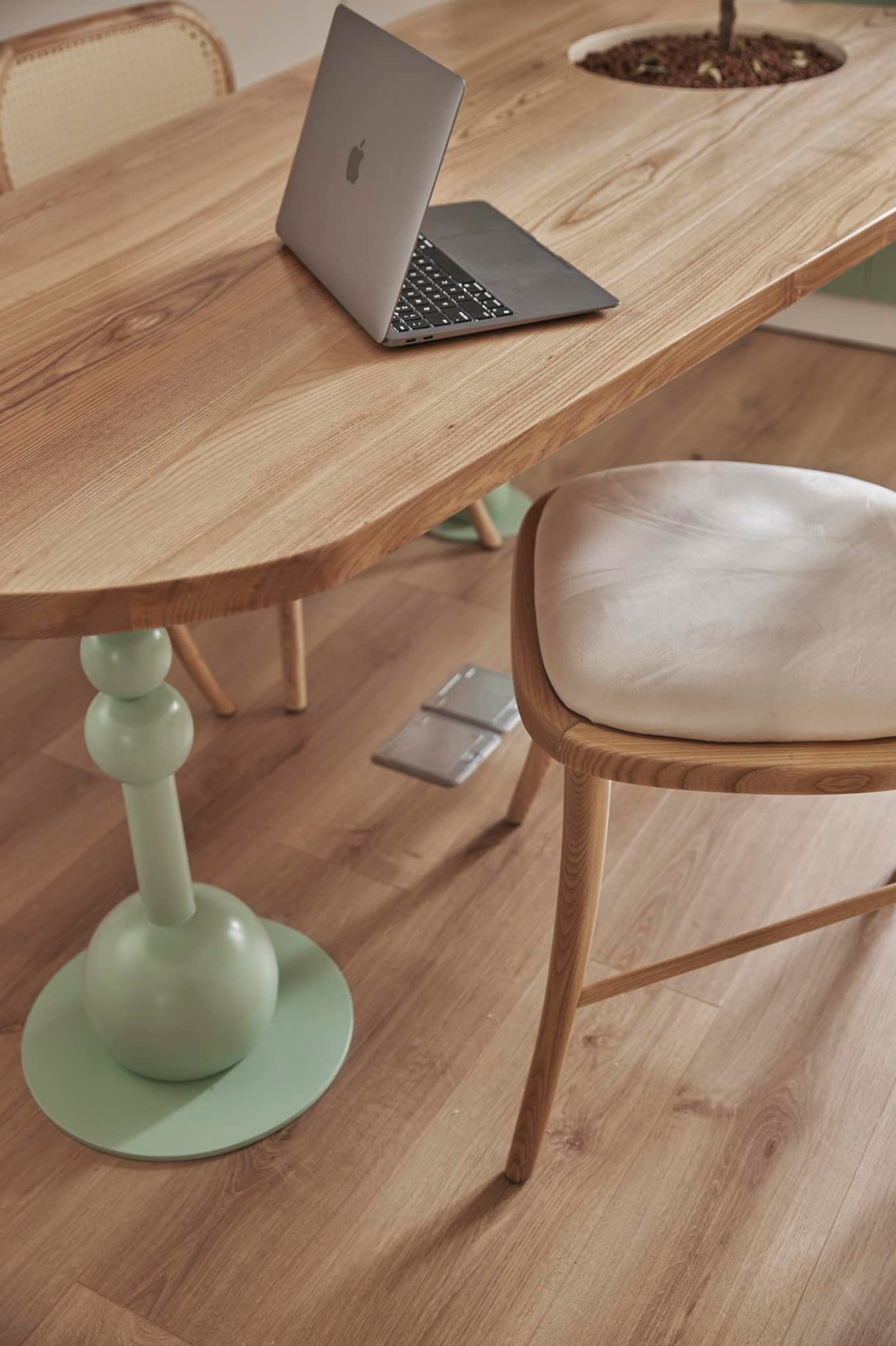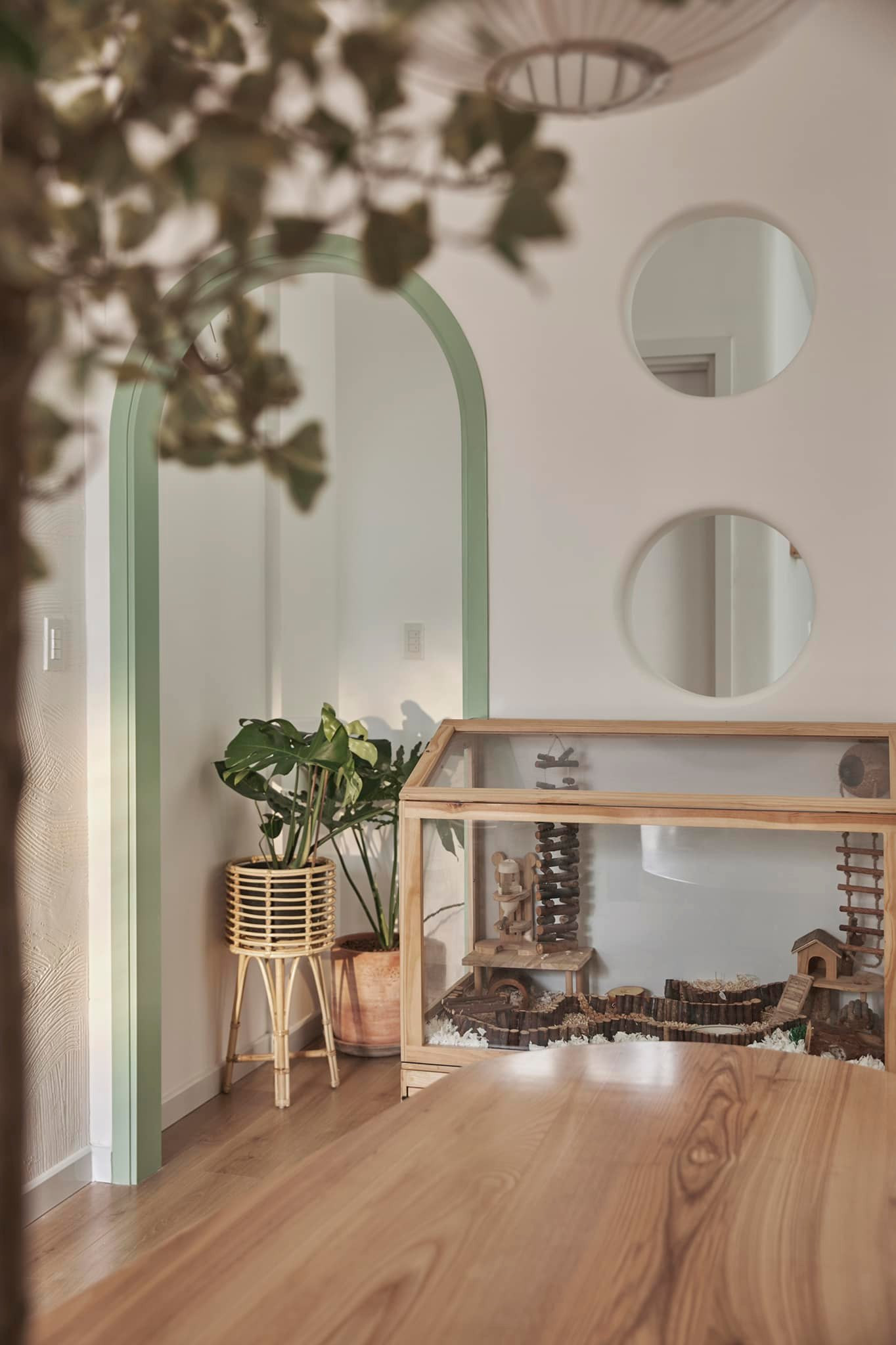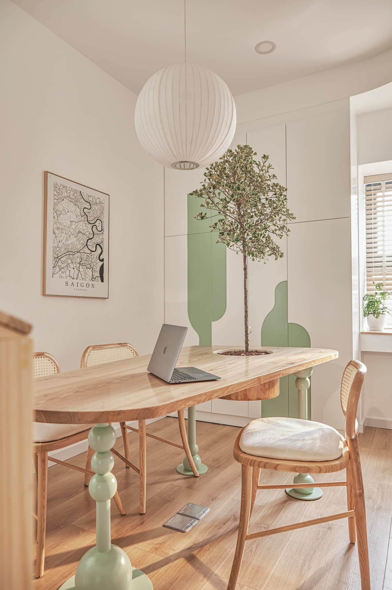 Đổi góc nhìn từ bên trong, kia là chuồng hamster và sóc bay, cũng được đo đạc cho đúng vị trí và liền mạch với nội thất nhà. Vì tính chất công việc có những ngày làm việc tại nhà, hoặc đợt covid lockdown, cả nhóm team toàn qua nhà chị tụ tập và làm việc nên chị thiết kế thành 1 nơi thật chill, ngập tràn ánh sáng để sáng tạo được nhiều ý tưởng. Chân bàn siêu yêu với những viên tròn tròn, độc đáo. Trong khi đó, chân ghế cũng được làm theo yêu cầu của chị, nhìn rất thanh thoát. Phòng có tủ đựng tài liệu/ tủ đựng đồ chơi/ sách của bé trai. “Tôi thấy dọn kiểu gì cũng bừa nên cứ giấu hết vô tủ là gọn ngay”, chị bạch Nữ nói.