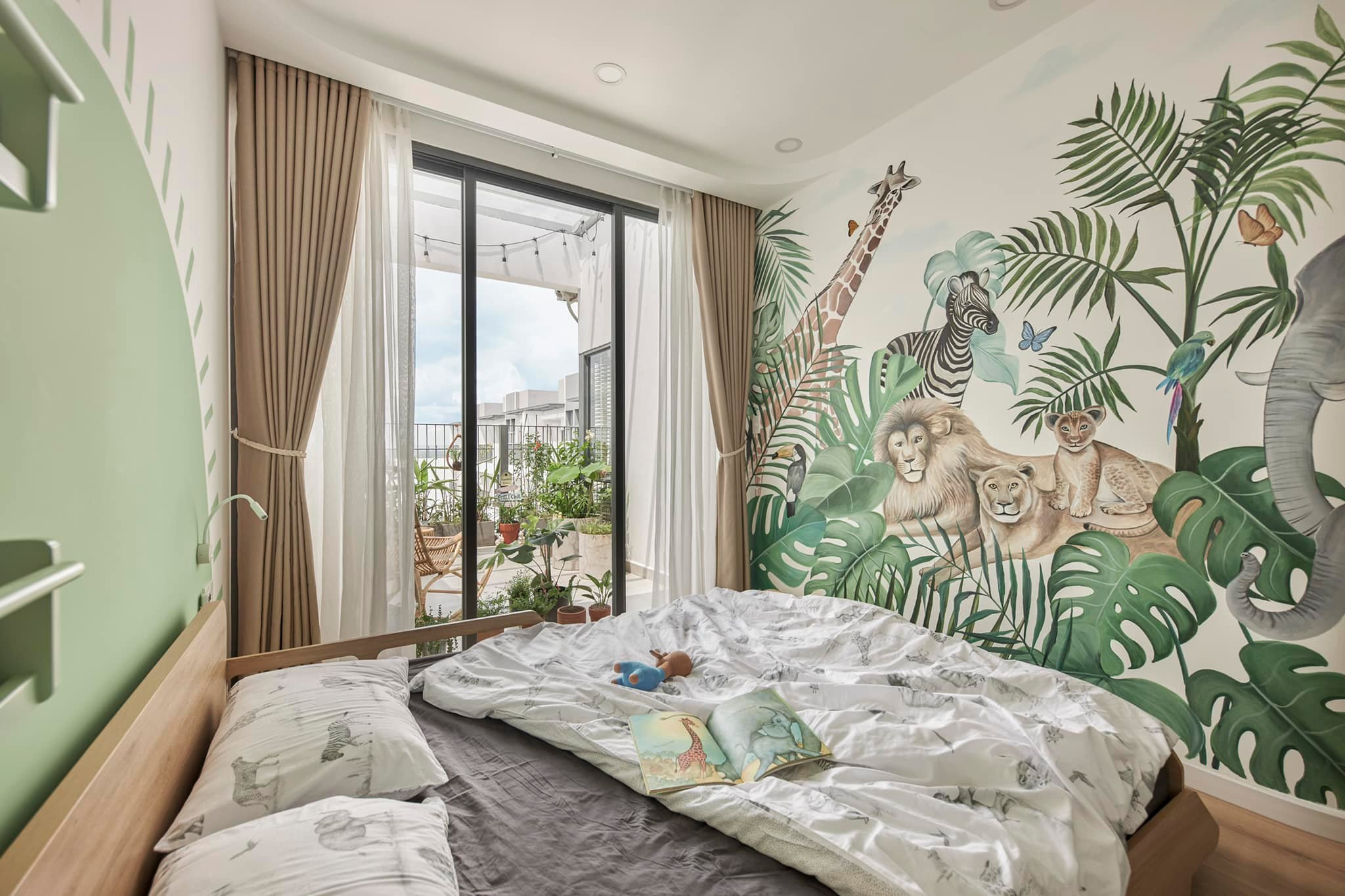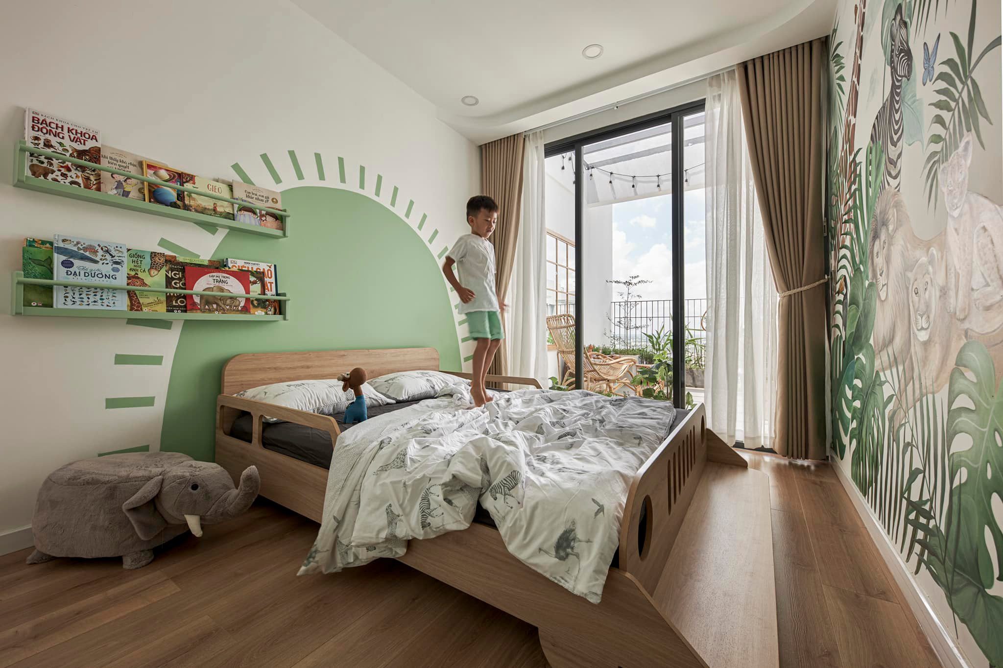 Trong phòng con, chị không lắp camera mà khoét 1 ô cửa kính như vậy để dù con có đóng cửa mở máy lạnh, hay khi con đóng cửa cần không gian riêng tư thì bố mẹ cũng có thể quan sát được con. Giường ngủ của Mio được thiết kế riêng hình chiếc xe, như là 1 chiếc xe jeep đang chạy trong rừng.