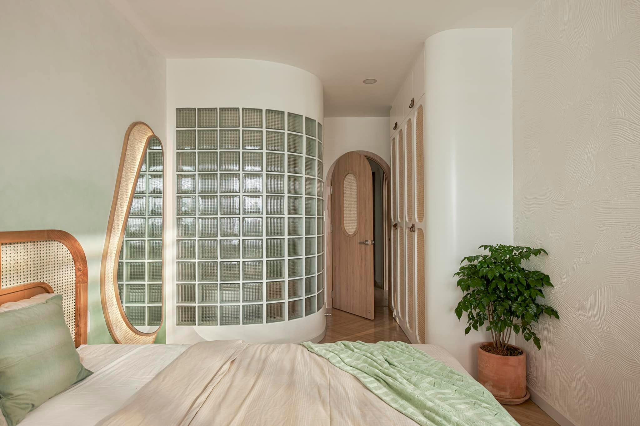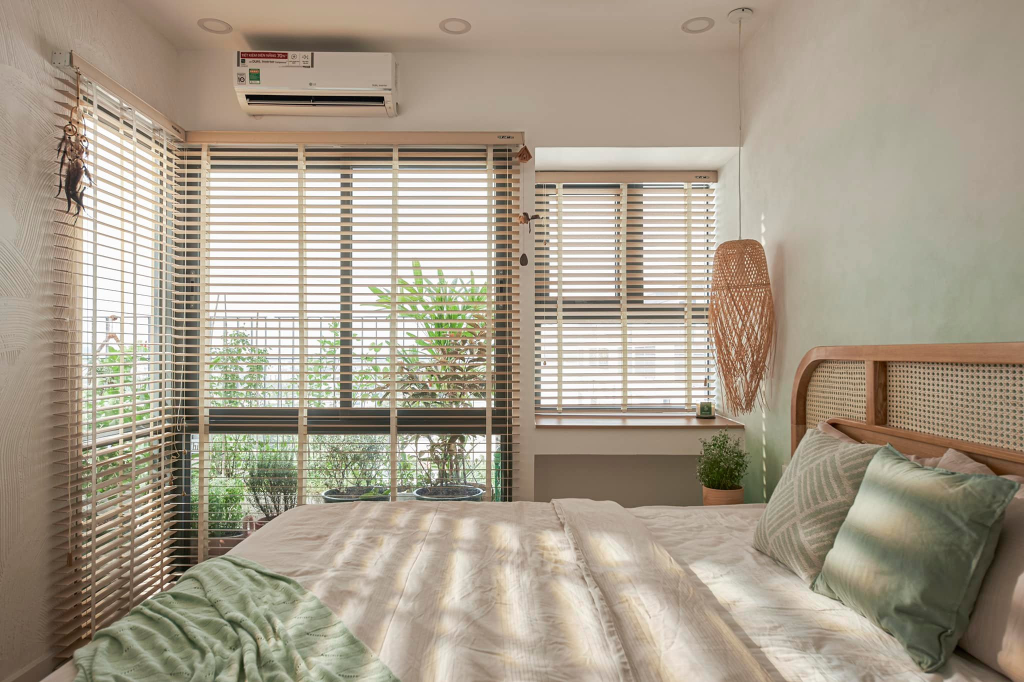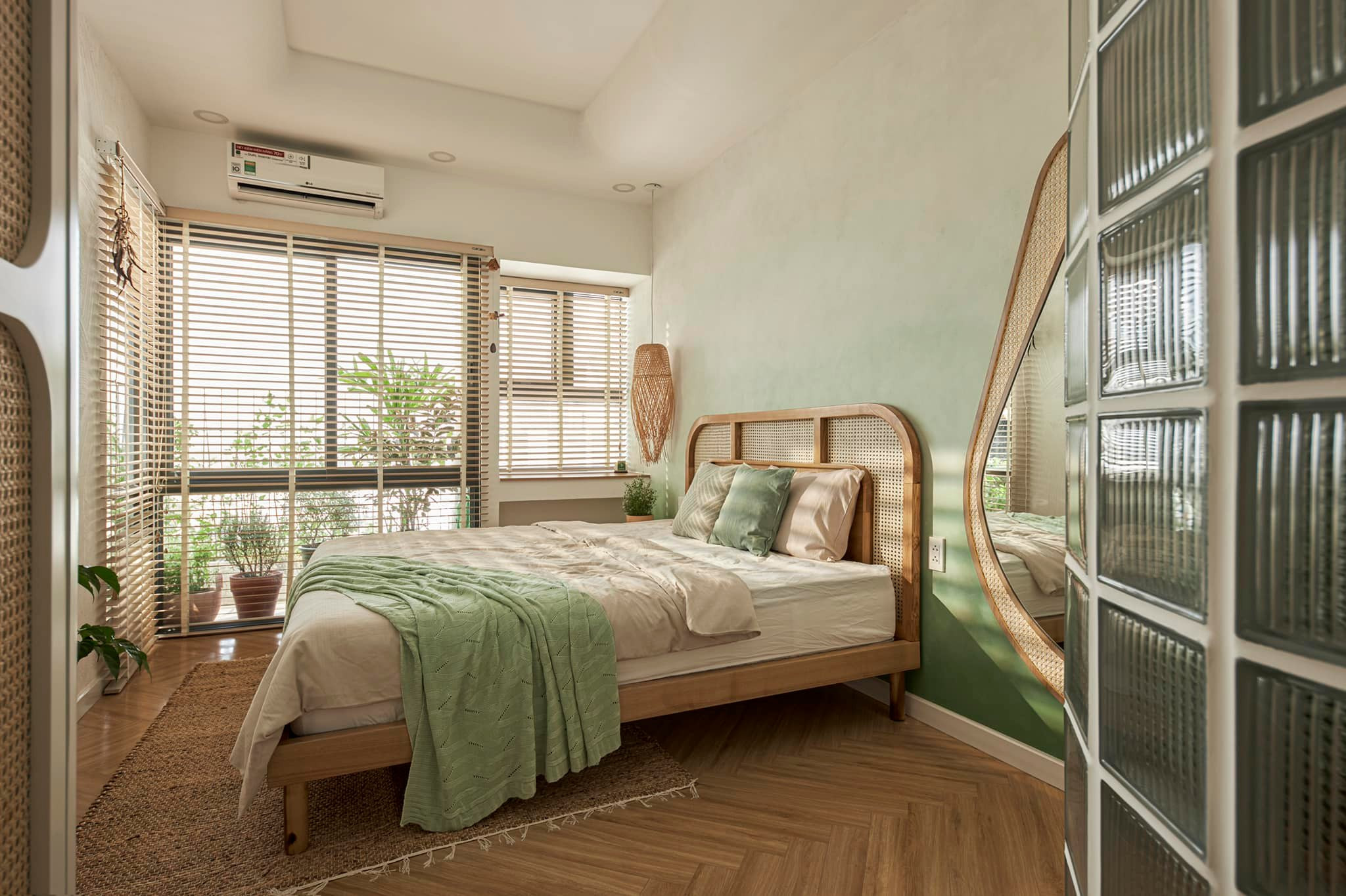 Phòng ngủ của hai vợ chồng vẫn 1 tone màu gỗ, xanh bơ nhạt và trắng kem rất hài hoà. Sàn gỗ lót hình xương cá, kết hợp mây tre, và trang trí tường hiệu ứng ombre là chị có không gian của resort. Chiến bàn mây nhỏ đầu giường là nơi để sạc điện thoại, khăn giấy, để vài món linh tinh.