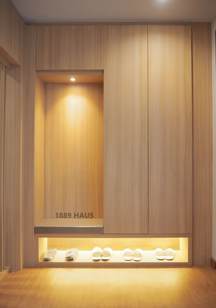 Một bức tường có thể "giải quyết" được nhiều chức năng như bàn trang điểm, kệ đựng đồ và tủ quần áo.