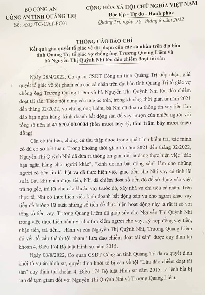 Trước đó, ngày 28/4, Cơ quan CSĐT Công an tỉnh Quảng Trị tiếp nhận, giải quyết tố giác về tội phạm của các cá nhân trên địa bàn tỉnh Quảng Trị tố giác vợ chồng ông Trương Quang Liêm và bà Nguyễn Thị Quỳnh Nhi lừa đảo, chiếm đoạt tài sản.