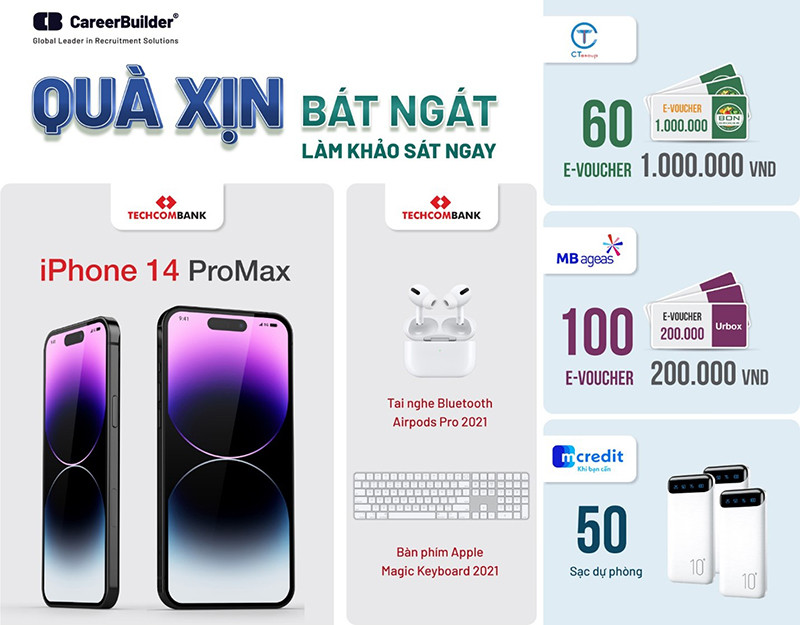Đặc biệt, đơn vị thực hiện khảo sát CareerBuilder.vn cùng các nhà tài trợ đồng hành tri ân những đóng góp, ý kiến của đáp viên tham gia chương trình qua các phần quà công nghệ giá trị và Evoucher mua sắm, ăn uống hấp dẫn. Các món quà sẽ được hệ thống lựa chọn ngẫu nhiên để gửi đến đáp viên may mắn trong suốt thời gian diễn ra khảo sát (đến hết ngày 31/12/2022).
