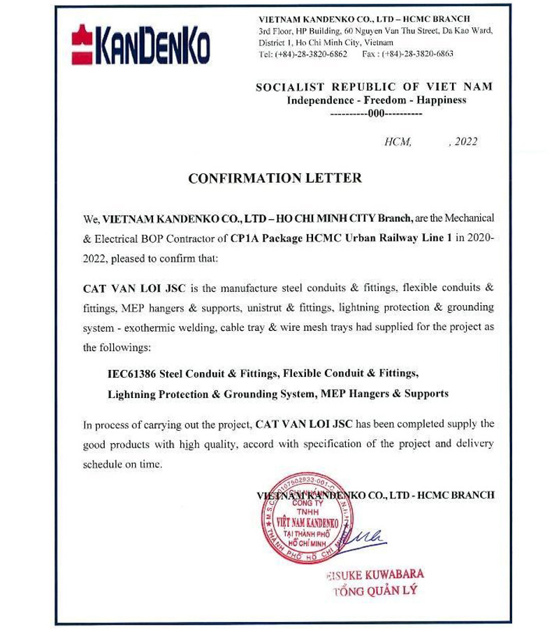 Bên cạnh đó, Cát Vạn Lợi còn cung cấp vật tư cơ điện cho công ty Kandenko để tiến hành thi công cho dự án tuyến đường sắt đô thị TP.HCM - Bến Thành - Suối Tiên.