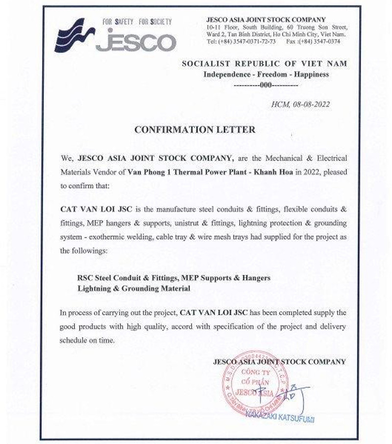 Hiện tại, Cát Vạn Lợi cũng đang là nhà cung cấp vật tư cơ điện chính - ống thép luồn dây điện và phụ kiện, hệ treo giá đỡ cơ điện, hệ thống chống sét tiếp địa cho tập đoàn Jesco Asia để lắp đặt xây dựng nhà máy Nhiệt Điện Vân Phong 1 - Khánh Hòa năm 2022.