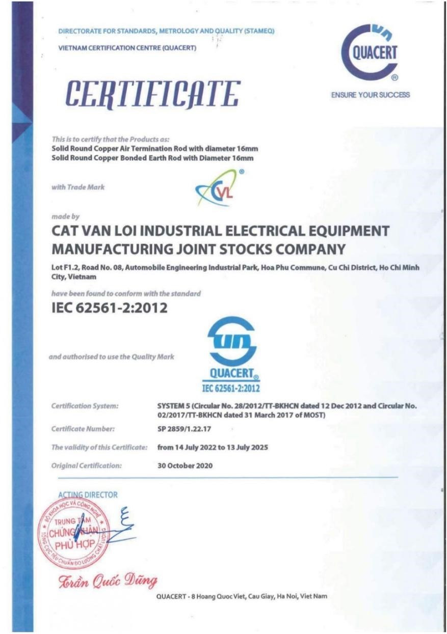 Hiện nay tại các dự án lớn nhỏ, kỹ sư cơ điện ưu tiên lựa chọn các sản phẩm cơ điện do Cát Vạn Lợi sản xuất như: kim thu sét, cọc tiếp địa, băng nhôm, băng đồng… đạt chuẩn IEC 62561 để thi công hệ thống chống sét hoàn chỉnh tại các công trình.