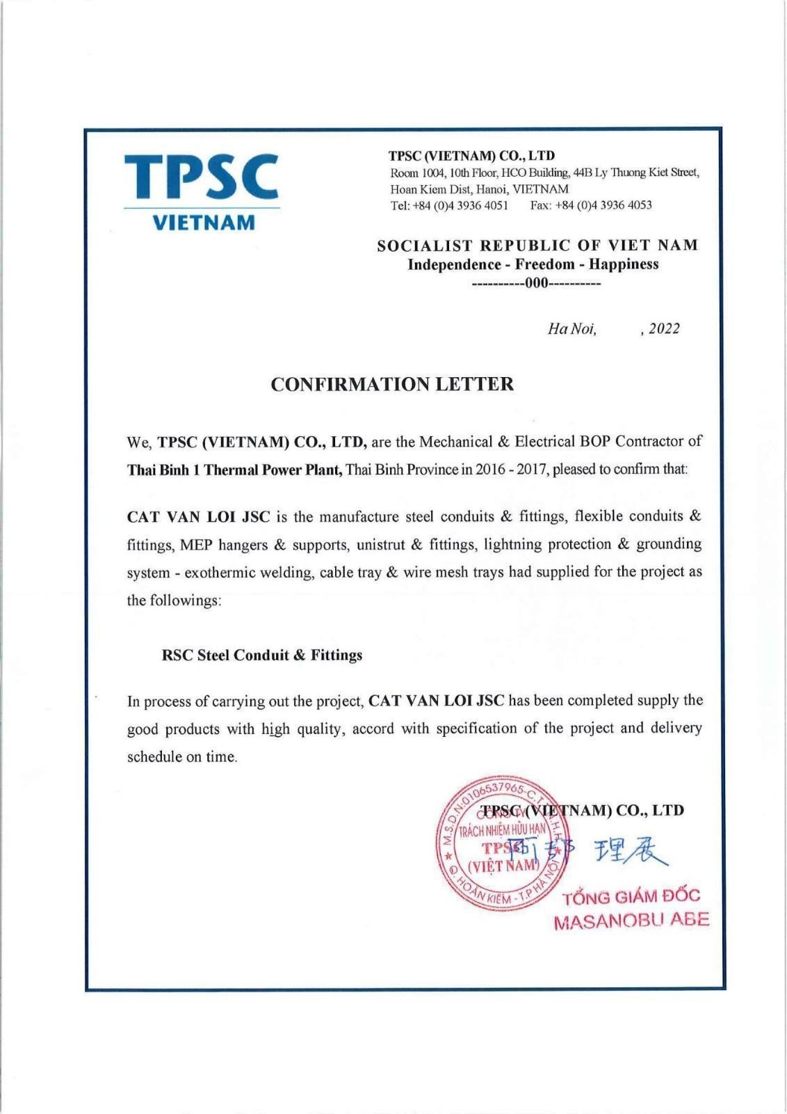 Bên cạnh đó, Cát Vạn Lợi cũng liên tiếp nhận thư đánh giá cao chất lượng và dịch vụ từ các chủ đầu tư công trình lớn. Điển hình, Cát Vạn Lợi cung cấp các sản phẩm cơ điện cho công ty Kandenko thi công cho dự án tuyến đường sắt đô thị TP.HCM - Bến Thành - Suối Tiên và cung ứng ống luồn dây điện và phụ kiện cho dự án nhà máy Nhiệt điện Thái Bình 1 cho tập đoàn TPSC Việt Nam…