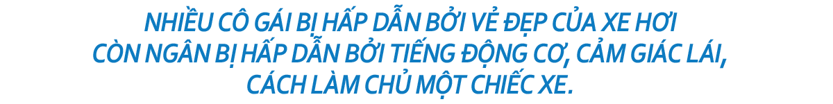Nhiều cô gái thường bị hấp dẫn bởi vẻ đẹp của chiếc xe, nhưng Ngân lại bị những chiếc xe hút hồn bởi tiếng động cơ, cảm giác cầm lái, cách làm chủ một chiếc xe. Ngân có thể lái xe cả ngày mà không biết chán, hành trình xuyên Việt hơn 1.700 km từ TP.HCM đến Hà Nội cùng anh trai trên chiếc xe thi đấu để tham gia giải đua VOC vừa qua là minh chứng rõ ràng cho tinh thần mê lái của cô.