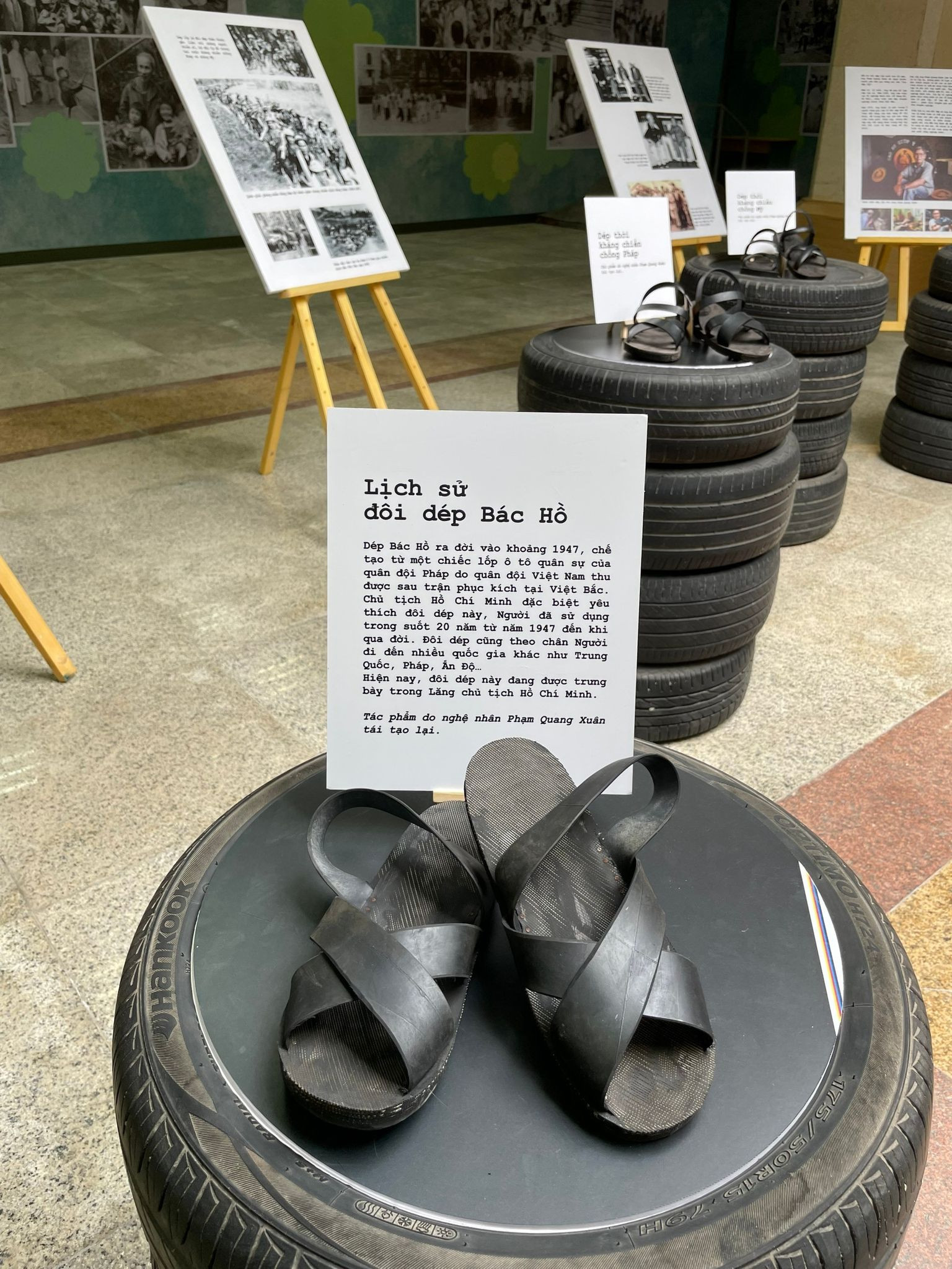 Nhân dịp kỷ niệm 77 năm Cách mạng tháng Tám và Quốc khánh 2/9, ngày 28/8, Trung tâm xúc tiến quảng bá di sản văn hoá phi vật thể Việt Nam phối hợp cùng gia đình nghệ nhân Phạm Quang Xuân tổ chức chương trình biểu diễn mang tên 'Huyền thoại bước chân' và triển lãm các mẫu dép cao su từ cổ điển đến hiện đại, tại Bảo tàng Hồ Chí Minh. 'Huyền thoại bước chân' là tác phẩm trình diễn theo kiểu kể chuyện tự sự kết hợp với trình chiếu và biểu diễn công đoạn làm dép lốp huyền thoại. Thông qua ngôn ngữ của nghệ thuật sân khấu bao gồm các loại hình hát, múa, nhảy hiện đại, kịch nói và tương tác trực tiếp với khán giả, vở diễn là một sáng tạo tập thể của các nghệ nhân, nghệ sĩ thể hiện góc nhìn mới về đôi dép cao su lịch sử. Đôi dép cao su không chỉ là một biểu tượng chiến thắng của quá khứ, đó còn là một biểu tượng dẫn dắt vào tương lai, là một tác phẩm nghệ thuật đại diện cho căn tính của người Việt về sự bền bỉ, sáng tạo, không ngừng biến đổi để thích nghi. Cho đến ngày hôm nay, dép lốp không chỉ mang câu chuyện lịch sử đơn thuần mà còn khoác lên mình những yếu tố của thời đại mới: năng động, trẻ trung, bền bỉ và đặc biệt thân thiện với môi trường.Tại triển lãm, người xem bị cuốn hút với hình ảnh đôi dép Bác Hồ do nghệ nhân Phạm Quang Xuân tái tạo. Dép Bác Hồ ra đời vào khoảng năm 1947, chế tạo từ một chiếc lốp ô tô quân sự của quân đội Pháp do quân đội Việt Nam thu được sau trận phục kích lại Việt Bắc. Chủ tịch Hồ Chí Minh đặc biệt yêu thích đôi dép này. Người đã sử dụng trong suốt 20 năm từ năm 1947 đến khi Người qua đời. Đôi dép cũng theo chân Người đến nhiều quốc gia như Trung Quốc, Pháp, Ấn Độ… Hiện nay đôi dép này đang được trưng bày trong Lăng Chủ tịch Hồ Chí Minh.