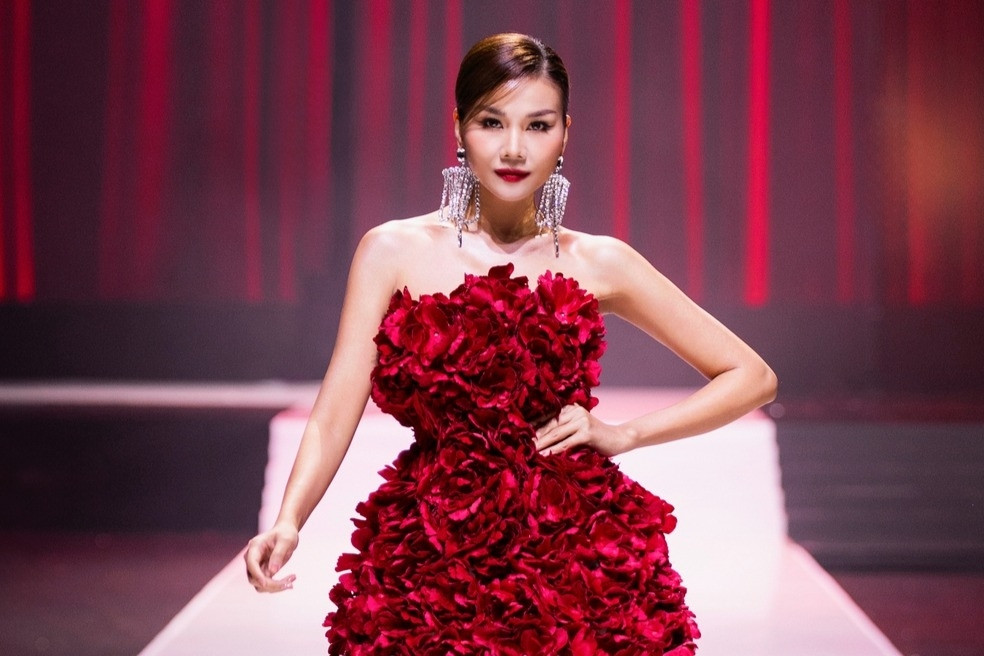 Khép lại bộ sưu tập là sự xuất hiện của Quán quân The Face Vietnam 2023 Huỳnh Tú Anh với vai trò vedette. Cô khoác đầm nhung cúp ngực quyến rũ, kết hợp găng tay voan bồng bềnh và bờm nhung với những chi tiết cách điệu từ hoa anh đào.