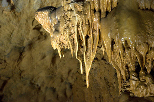 Thạch nhũ mọc lên  chen chút khiến vách núi hai bên như khép hẹp dần