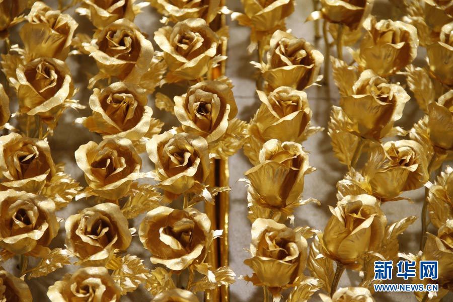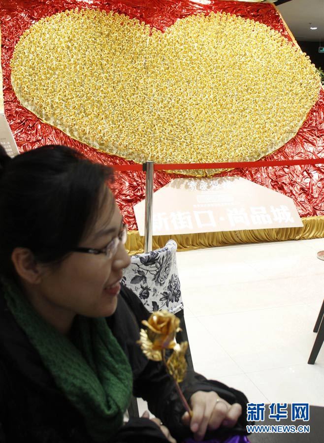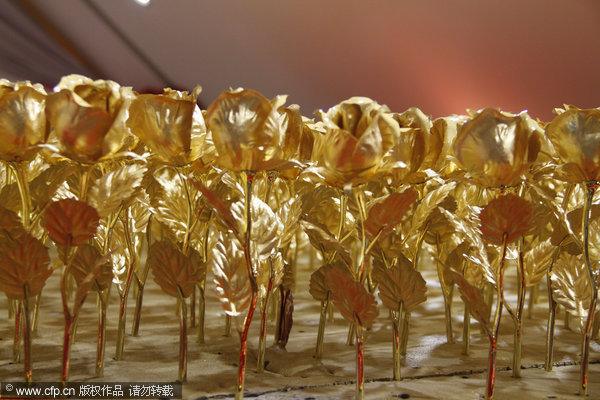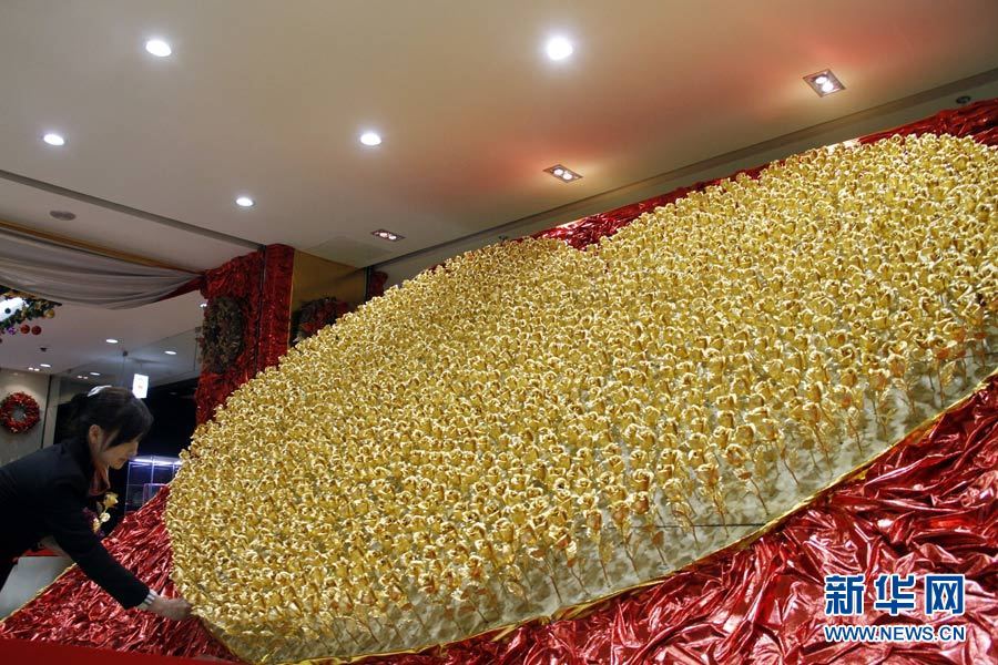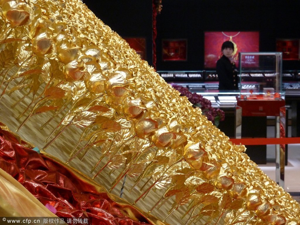 Cả một góc phố thành phố Nam Kinh như bừng sáng bởi sự xuất hiện của bó hoa khổng lồ được làm từ vàng 99,99% này. Những bông hoa được làm hết sức tinh xảo và mềm mại, mỗi cánh hoa chỉ mỏng bằng cánh ve, dày khoảng 0,12 micromet.