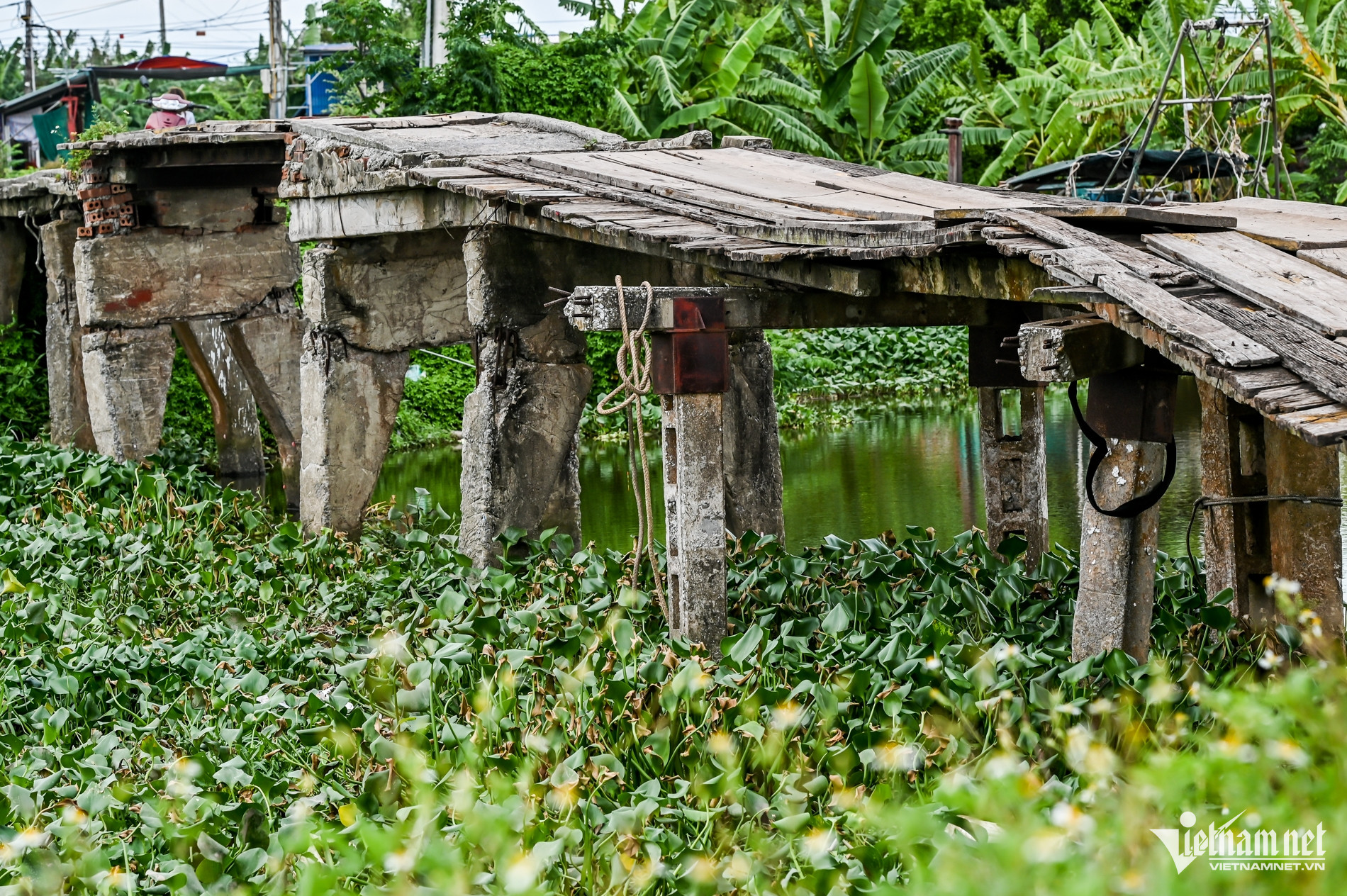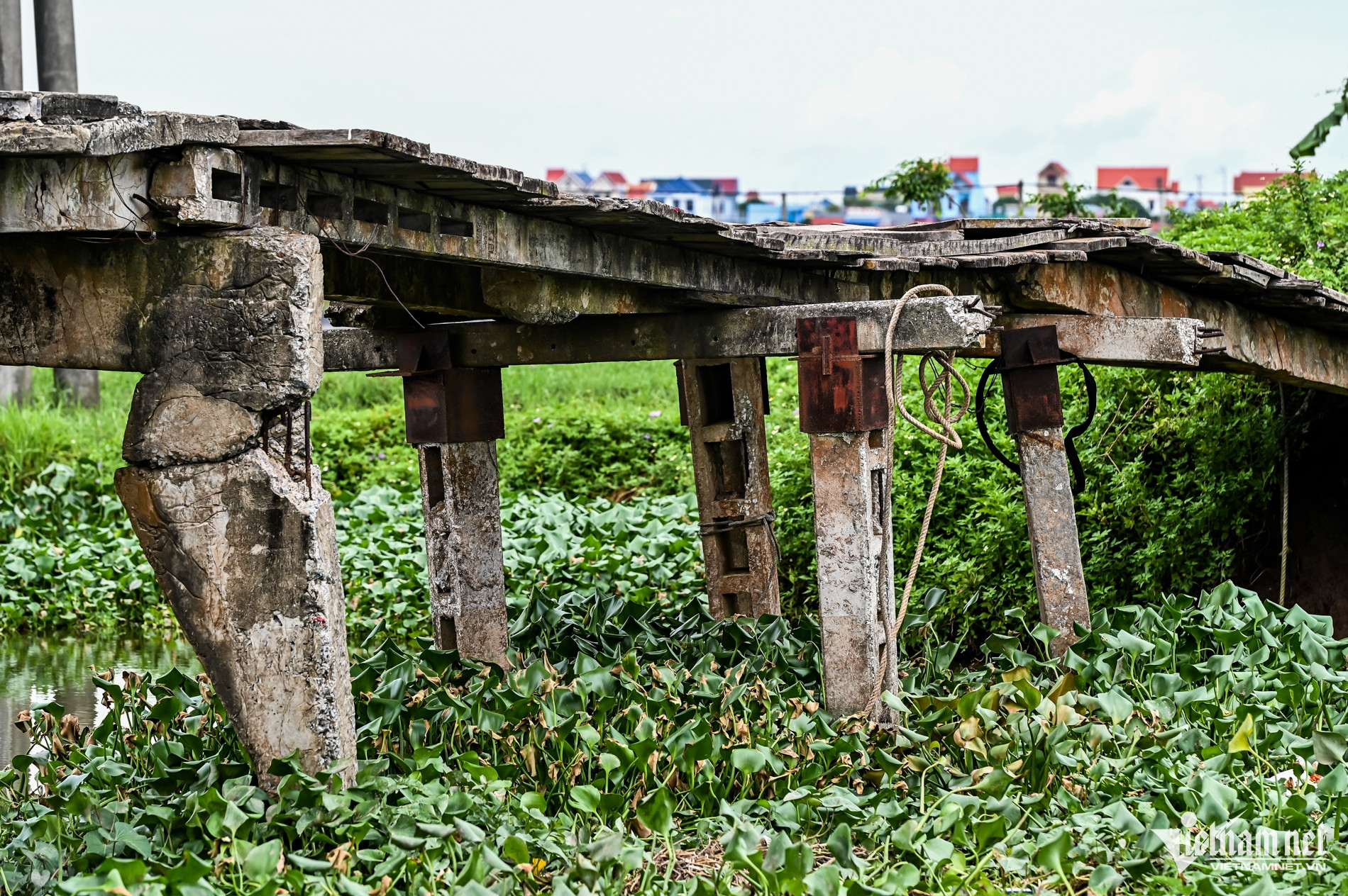 Mặt cầu được sửa chữa tạm thời bằng cách lót các tấm ván quan tài bằng gỗ từ mấy năm nay. Hiện tại, do cầu quá xuống cấp, gia đình tôi có cháu nhỏ cũng không dám cho các con tự đi lại qua cầu mà luôn phải có người lớn đi kèm”.
