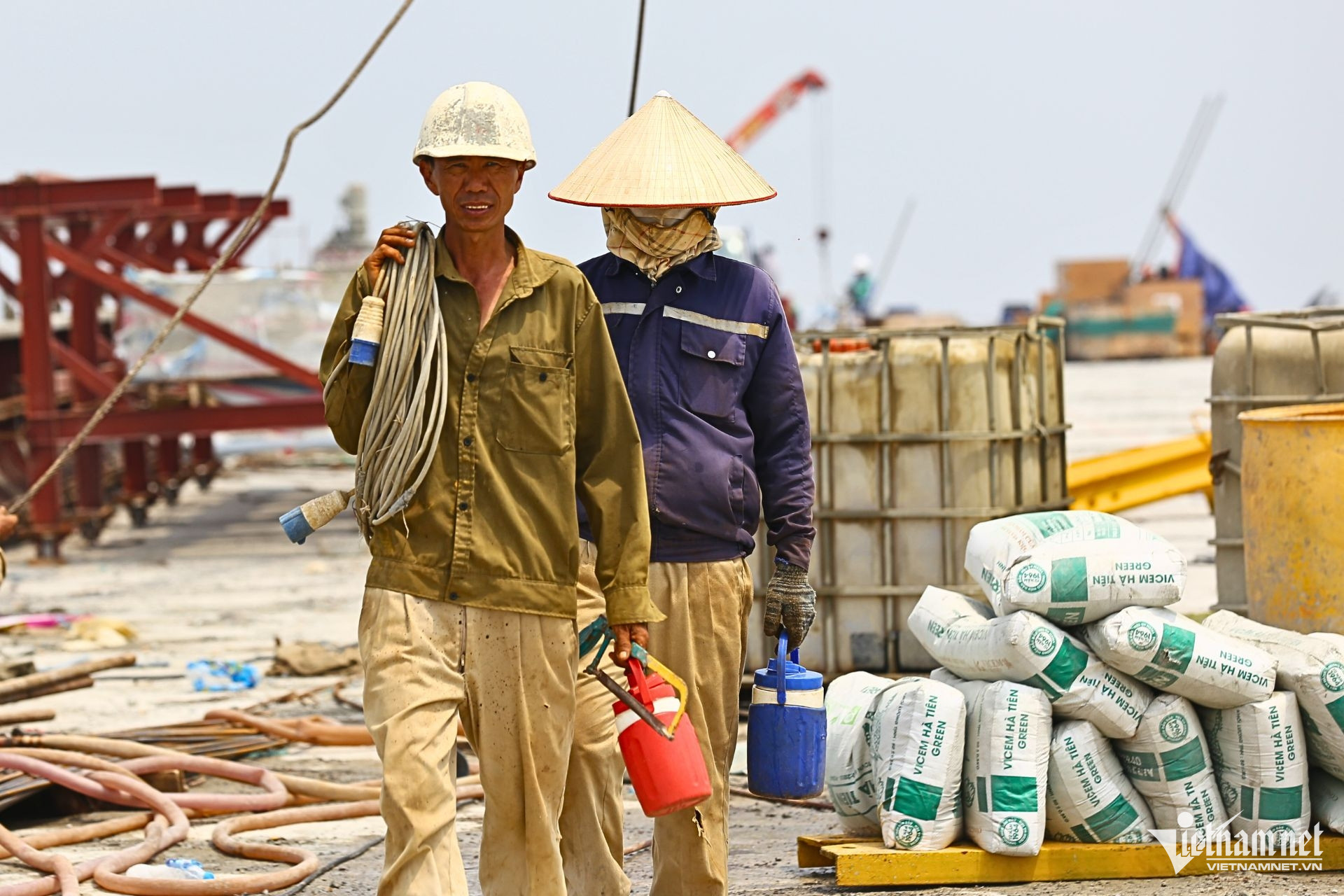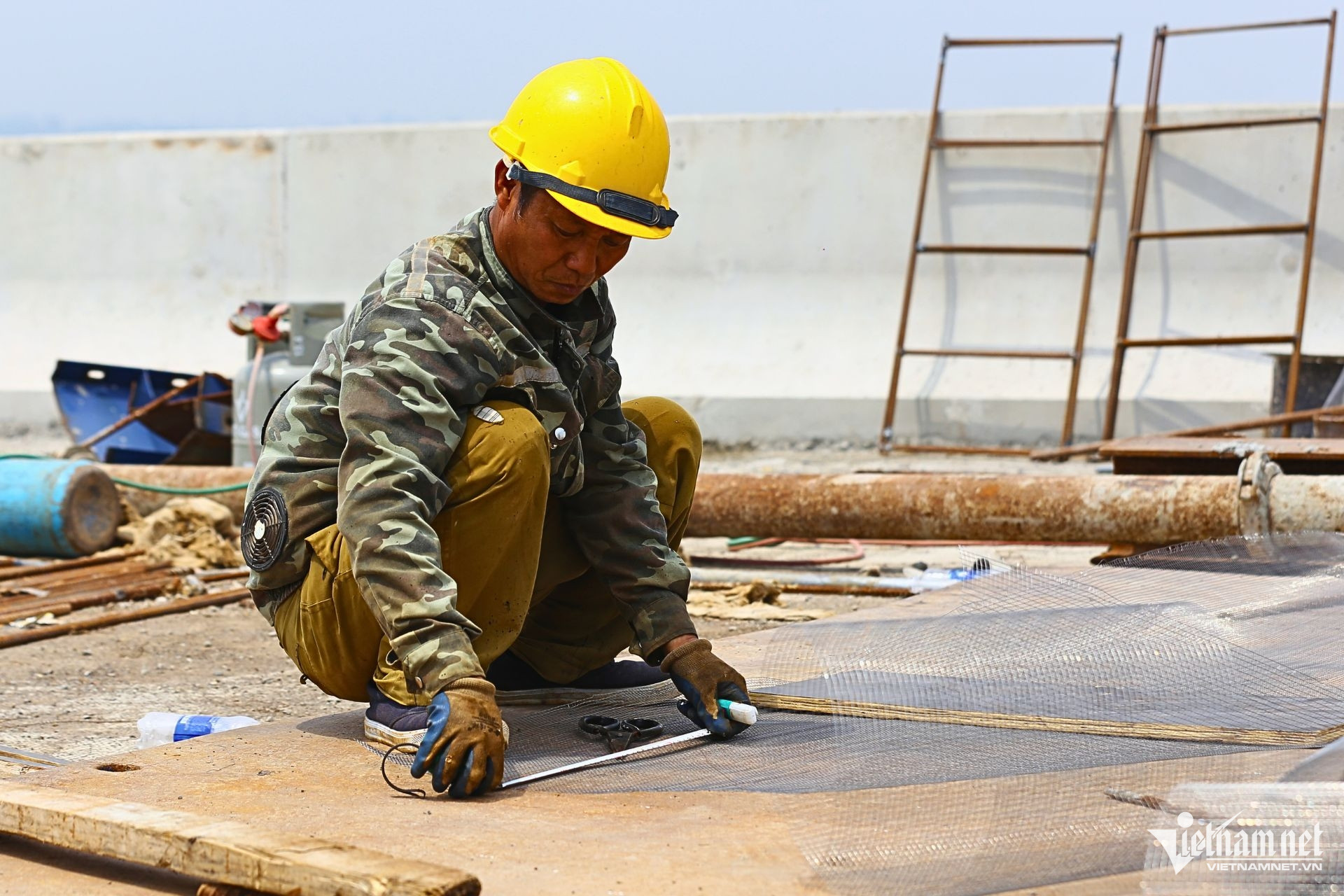 Ghi nhận của VietNamNet, những ngày cuối tháng 4, trên công trường, nhiều công nhân cùng máy móc thiết bị đang hoạt động tối đa công suất. Các hạng mục cuối như thảm nhựa, lắp lan can, hệ thống điện và vệ sinh mặt cầu đang được gấp rút hoàn thiện.