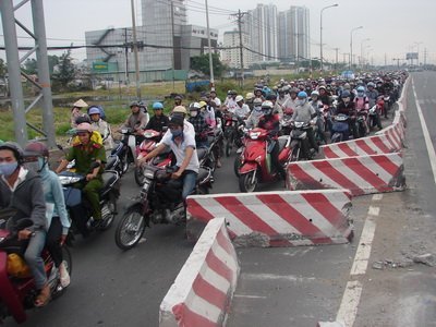 Ngay đầu cầu Sài Gòn, hướng giao thông từ Thủ Đức vào thành phố xe cộ bị nghẽn lại. Đặc biệt khác với trước đây, xe hai bánh nay không được đi vào làn đường dành cho xe ô tô nên ứ đọng lại khá đông.