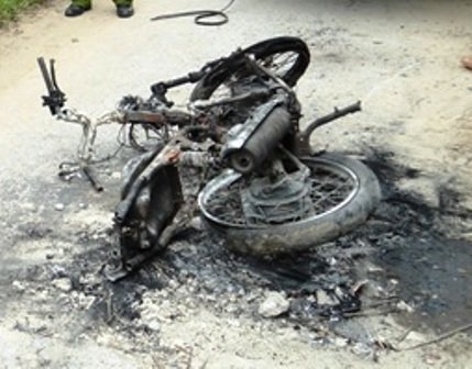 Chiếc xe máy của 2 cẩu tặc cũng bị người dân châm lửa đốt cháy trụi.