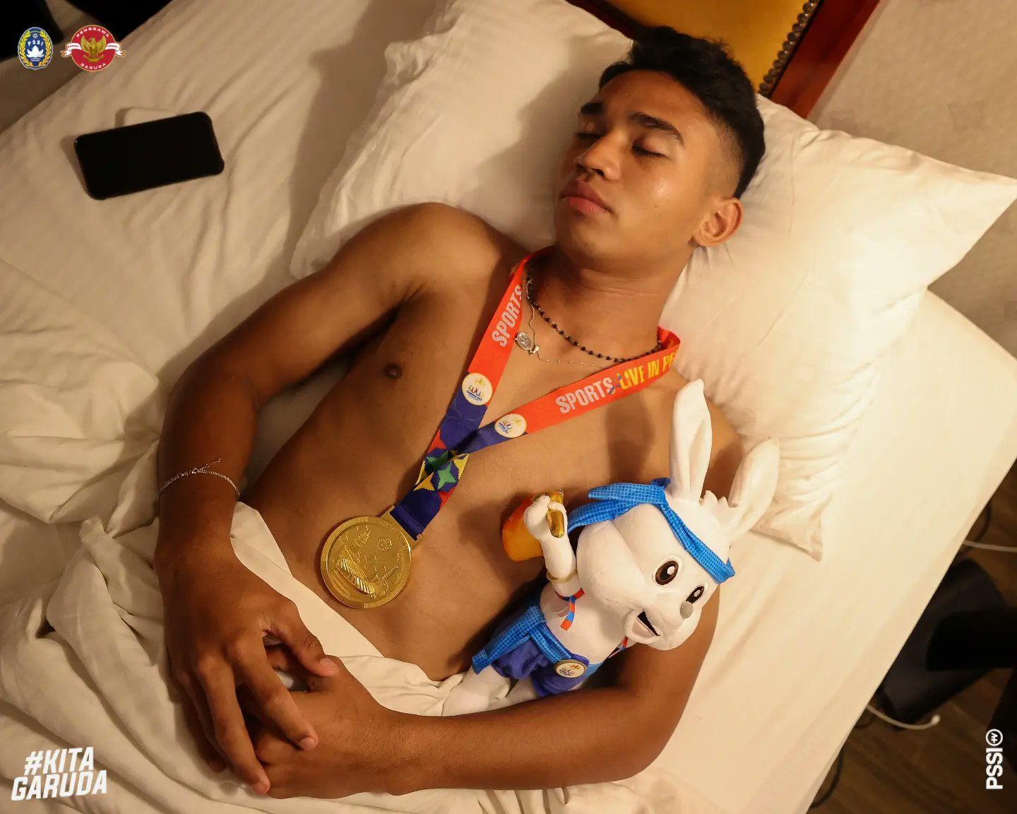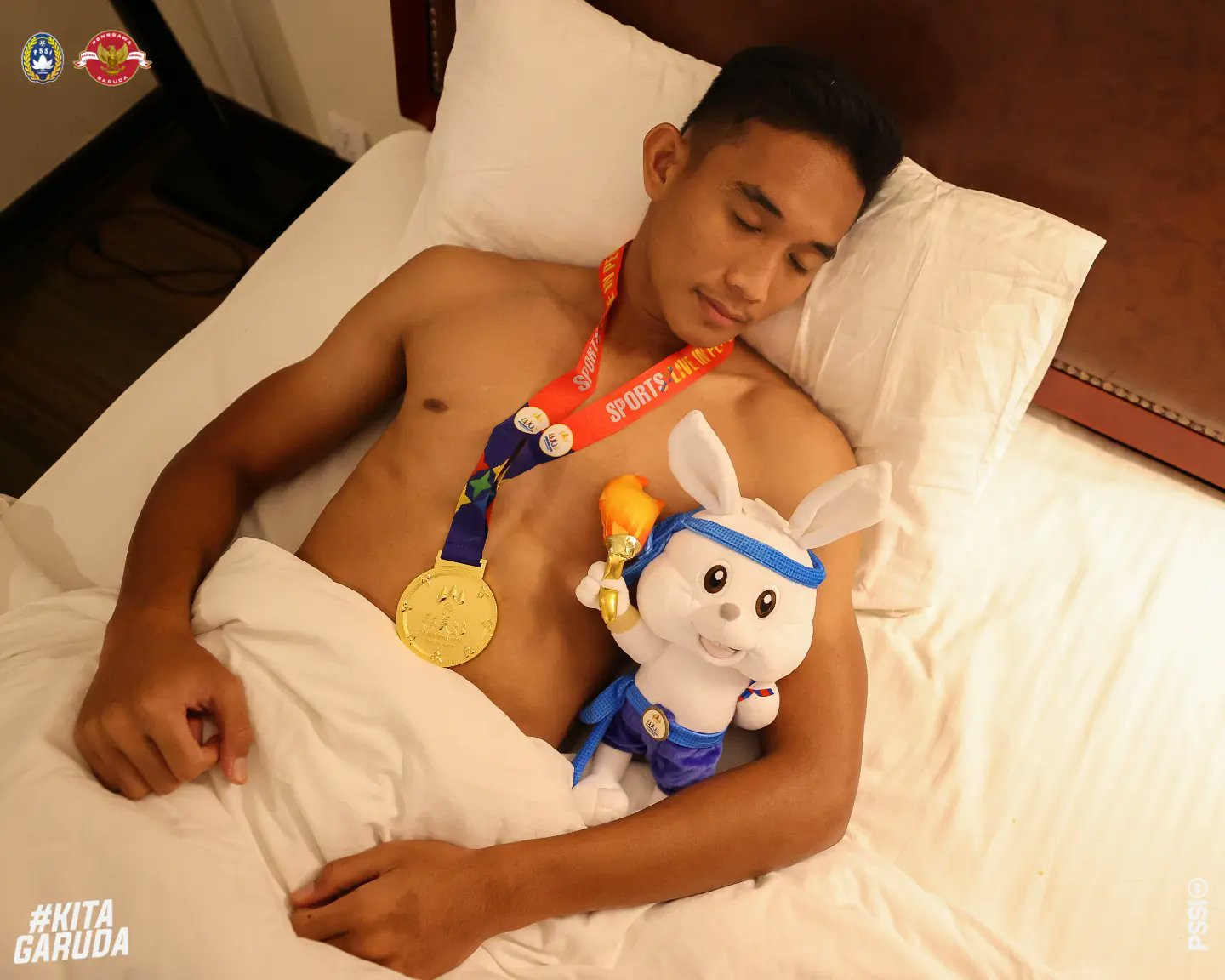 Sau khi đánh bại U22 Thái Lan 5-2 trong trận chung kết SEA Games 32 đầy căng thẳng và kịch tính, nhiều cầu thủ U22 Indonesia đeo cả huy chương vàng khi đi ngủ.