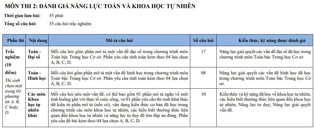 Môn thi 2 là Đánh giá năng lực Toán và Khoa học tự nhiên, gồm 35 câu hỏi trắc nghiệm, thời gian làm bài 55 phút.