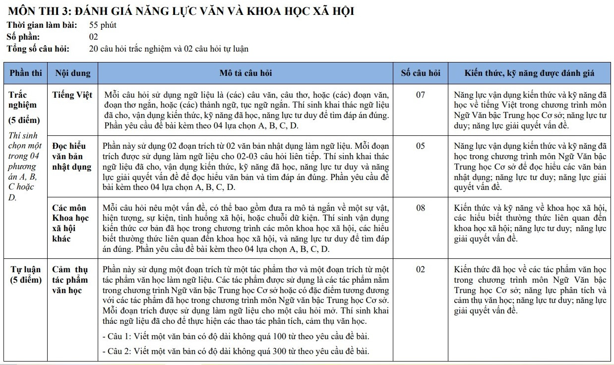 Môn thi 3 là Đánh giá năng lực Văn và Khoa học xã hội, gồm 2 phần với 20 câu hỏi trắc nghiệm và 2 câu hỏi tự luận, thời gian làm bài 55 phút.