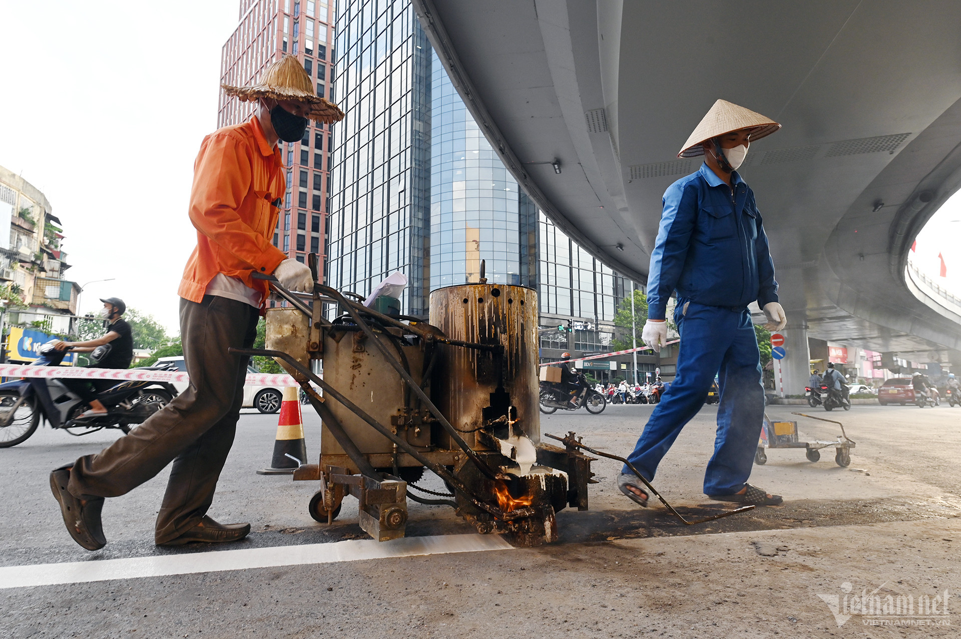 Lúc này công đoạn dọn dẹp phế liệu, kẻ lại vạch vôi bên dưới gầm cầu vẫn đang được tiến hành.