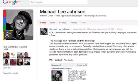 Nhà phát triển web Michael Lee Johnson muốn nhanh chóng tăng thêm nhiều bạn trên mạng xã hội Google+. Vì thế, anh này chạy một quảng cáo trên Facebook để mời tất cả mọi người “đặt vòng” (Circles) mình, nhưng Facebook tỏ ra khó chịu.