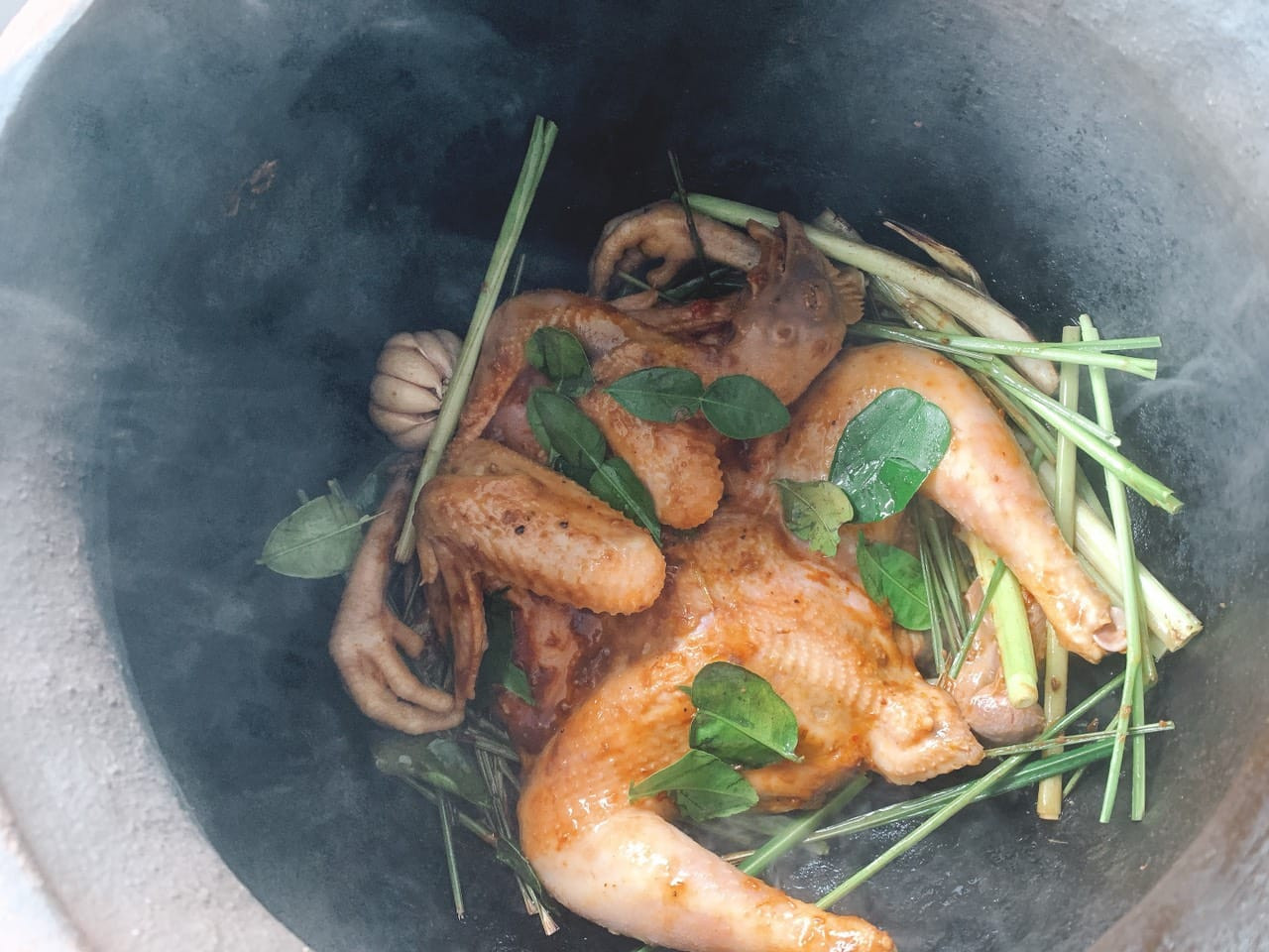 Những con gà đồi nặng khoảng 1,3–1,8kg được làm sạch, ướp muối, sả, tỏi, ớt và lá chúc. Đầu bếp lót một lớp sả, lá chúc và muối dày dưới đáy nồi, đặt gà đã quét dầu (hoặc mật ong) lên trên, rồi đốt lửa.