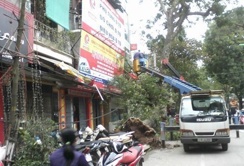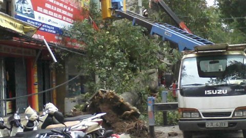 | Cây sao cổ thụ bị bật gốc trên phố Lò Đúc. (Ảnh: Q.Dũng) |