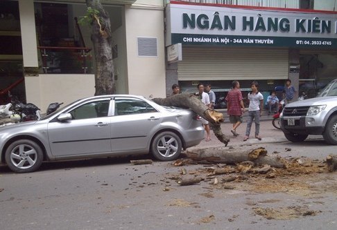 Vụ việc xảy ra vào khoảng 13h trưa nay (ngày 17/7) tại phố Hàn Thuyên (Hoàn Kiếm, Hà Nội). Vào thời điểm trên, 1 cây gỗ lớn đổ trúng chiếc xe Mazda đang đỗ trên phố Hàn Thuyên khiến chiếc xe này bị hư hỏng nặng.