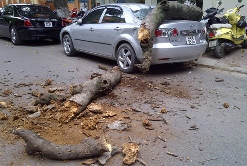 đã đỗ ngay dưới gốc cây và đúng lúc cây đổ trúng. Rất may, không có ai bị thương
