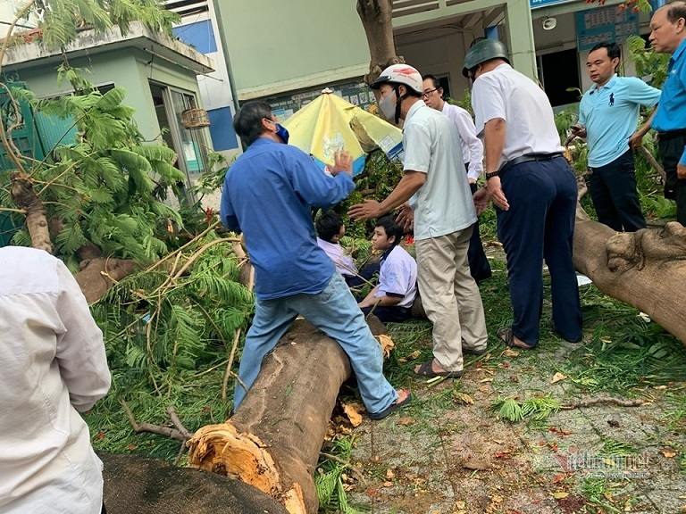 Cây phượng vĩ có đường kính khoảng 1m, tán rộng bất ngờ bật gốc, đổ ập xuống. Lúc này, một nhóm học sinh đang đi bên dưới không kịp phản ứng đã bị thân cây và tán lá đè lên người.