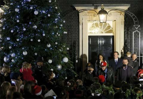 Thủ tướng Anh David Cameron chứng kiến lễ thắp sáng cây thông Noel ở số 20 Phố Downing. (Ảnh: Reuters)