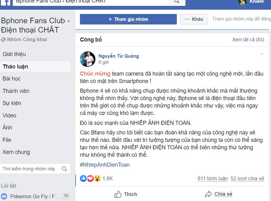 Chia sẻ trên Group Bphone, CEO Bkav Nguyễn Tử Quảng đã gửi lời chúc mừng nhóm camera của Bphone đã hoàn tất sáng tạo một công nghệ mới, lần đầu tiên có mặt trên smartphone.